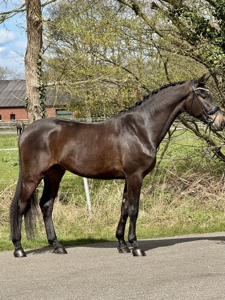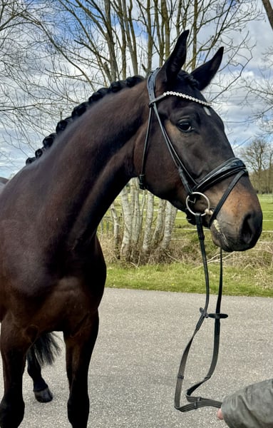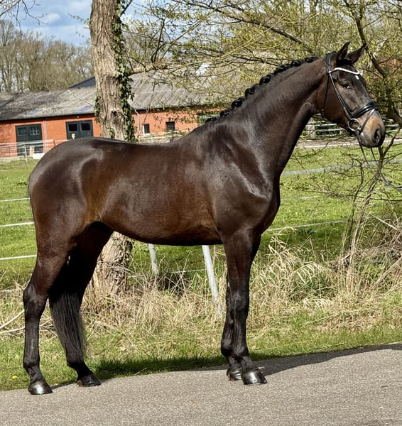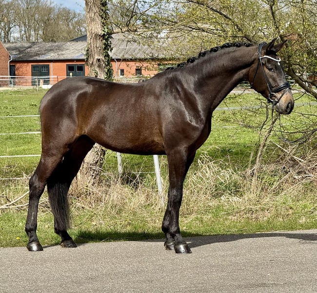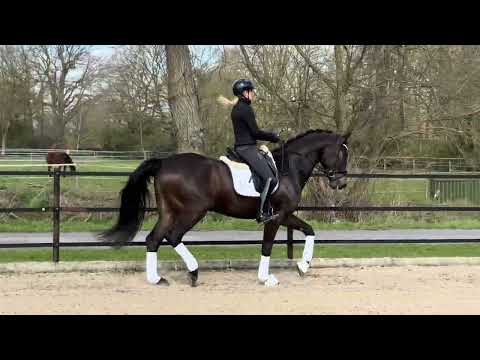 Zum Verkauf steht hier ein zauberhafter Wallach von Dynamic Dream x De Niro direkt aus Züchterhand. Darino wie ich (die Reiterin) ihn nun getauft habe, ist ein Pferd mit absoluter gute Laune Garantie. Er ist das perfekte Mittelmaß von sportlich engagiert und total entspannt. Obwohl er erst seit Kurzem unter dem Sattel ist, bringt ihn so schnell nichts aus der Ruhe. Er wird täglich von seinen über 80-Jährigen Züchtern gehändelt und mir jedes Mal zum Reiten vorbeigebracht. Das meistert er souverän und ist absolut brav und gelassen im Umgang. Bei Ihnen ist er auch aufgewachsen und durchgehend in der Hand gewesen. Im letzten Jahr wurde er ganz ganz kurz an das Reitergewicht gewöhnt und bekam dann noch einmal Zeit, körperlich zu reifen. Diese Entwicklung ist auch nach wie vor nicht abgeschlossen. Darino verfügt über ein ausgesprochen stabiles und korrektes Fundament mit sehr guten Hufen. Ich würde ihn als etwas „vom alten Schlag“ beschreiben, was aber meines Erachtens nach für die Haltbarkeit ein großer Vorteil ist. Er muss lediglich noch etwas in seinen großrahmigen Körper hineinwachsen. Im Februar diesen Jahres habe ich ihn schonend angearbeitet. Er zeigte sich hierbei stets extremst brav und kooperativ und hat noch keinen falschen Tritt gemacht. Er vermittelt dem Reiter trotz seines jungen Alters ein absolut sicheres Gefühl, weshalb ich mir vorstellen könnte, dass auch anfangs unsichere Reiter sich schnell auf ihm wohlfühlen. Er verfügt über drei gleichermaßen wirklich tolle Grundgangarten, aus denen man sicherlich noch richtig was herausholen kann. Ich habe ihn auch schon auf verschiedenen Plätzen und Hallen geritten; das stört ihn alles nicht. Darino ist von Kopf bis Fuß ohne Befund getüvt und hat keine bekannten Krankheiten. Wer ein Pferd mit wirklich sehr guter Grundqualität, top Fundament, einer herausragenden Rittigkeit und einem super Charakter sucht und was die körperliche Entwicklung angeht vielleicht noch etwas Fantasie hat, der hat hier die einmalige Chance auf genau das. Hätte ich das Geld und den Platz würde ich ihn mir selbst sichern. Ich bin wirklich absolut überzeugt von diesem Pferd. Er bereitet mir jeden Tag unglaubliche Freude. Kontaktieren Sie mich gerne telefonisch unter 0151-46756498.