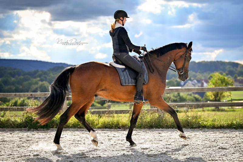 This exceptional 4-year-old Oldenburg gelding already impresses with his striking appearance and combines size, presence, and an exceptionally friendly nature. Standing at approximately 1.86 meters, he is a true eye-catcher! As a son of the top sire "Asgard’s Ibiza" from a very strong dam line, he possesses excellent genetic potential for a successful future. He moves with a spacious, ground-covering walk, an elastic, rhythmical trot, and a well-balanced, expressive canter. In training, he shows daily motivation, cooperation, and a keen willingness to learn. The gelding has been raised healthily, with proper horse care, and with great care and patience by us. He is familiar with the wash station, lunging, long-reining, groundwork, light pole work, and relaxed trail rides. He has already been introduced to the competition environment in a positive and stress-free manner and loads without issues. Currently, he is competing confidently at solid Dressage Horse Level A, having made significant progress in recent weeks, including the beginning of lateral work and short turns appropriate for his age. He knows the veterinarian only from routine dental care and vaccinations, and has been regularly examined by hoof orthopedists and osteopaths. A recent comprehensive health check from December 2023 is available. Beyond his physical qualities, the gelding stands out for his exceptional character: He is easy to handle, very human-oriented, open, honest, herd-compatible, and impressively composed for his young age. An highly promising young dressage prospect with all the potential to excel in the arena, and a personality that makes him a lifelong partner—even for ambitious amateurs. For his further development, we wish for supportive hands and an environment with plenty of movement and social contact. We welcome your phone inquiry and are happy to send videos upon request!