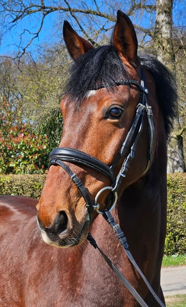 Dieser vielversprechender Allrounder, geboren im Jahr 2020 mit einem derzeitigen Stockmaß von ca. 1,65m sucht im Auftrag der Züchterin wegen Zuchtaufgabe ein neues Zuhause. "Paddy" zeigt sich bei der täglichen Arbeit immer motiviert und lernwillig, egal, ob bei der dressurmäßigen Arbeit, im Gelände, an der Longe oder über kleine Sprünge. 4jährig angeritten wird er zur Zeit seinem Alter entsprechend vielseitig ausgebildet. Er ist dressurmäßig auf A-Niveau, L-Lektionen werden nun langsam erlernt, er geht artig und unerschrocken ins Gelände und hat auch kleine Sprünge unter dem Reiter bereits gemeistert. In Letzterem wurde er bisher nicht weiter gefördert, zeigt hier aber auch Potential und die richtige Einstellung zum Sprung. "Paddy" ist im Umgang, beim Schmied und beim Verladen artig und ist regelmäßig entwurmt und geimpft. Hunde, Trecker, Kinder, etc. sind ihm vertraut. Aktuell ist er barhuf, steht nachts in der Box und tagsüber draußen in der Gruppe, kennt aber auch 24/7 Weide und sowohl Wallach-, als auch gemischte Gruppen. Für weitere Informationen und einen Besichtigungstermin nehmen Sie gerne Kontakt auf. Ein Probereiten ist nach Absprache möglich.