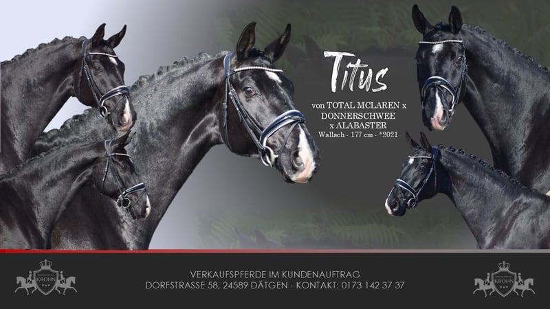TURNIERERFOLGREICHER (MERHFACH PLATZIERT / SIEGREICH NOTE 8,7), BILDSCHÖNER, LEICHTRITTIGER DRESSUR RAPP WALLACH, MIT VIEL TYP UND GANG & DEM HERZ AM RECHTEN FLECK - TOTILAS BLUT - Junioren geeignet! Zum Verkauf steht in Vertretung des Besitzers = Züchter, dieser höchst sporterfolgreiche, 177cm große, 5 j., oldenburger rapp Wallach, mit bester moderner Dressurabstammung von TOTAL MCLARAN (Totilas) x DONNERSCHWEE x ALABASTER. OPTISCH besticht der Kraftvolle und deutlich im Hengsttyp stehende, großrahmige "TITUS" in Lackscharzer Jacke (hinten 2 x weiß + Stern + Schnippe), mit seinem typvolen Gesicht, auffällig schönem Genick und harmonischer Gebäudeaufteilung. In BEWEGUNG zeigt sich ein rittiger, elastischer Dressurwallach mit drei gleichwertig sehr guten auffälligen Grundgangarten, bei schwingendem Rücken, Bergauftendenz, ansprechendem Seitenbild und einem gut gewinkelten, abdruckstarken Hinterbein mit hoher Bereitschaft zur Lastaufnahme. Auf TURNIER konnte "TITUS" bereits zahlreich Platzierungen in Reitpferde- und Dressurpferde A Prüfungen sammeln. Auf sein Konto gehen unter anderem ein Dressurpferde A - SIEG mit der Wertnote 8,7. Seid beginn seiner Ausbildung befindet sich "TITUS" in professionellem Beritt und auf Dressurpferde L Niveau. CHARAKTERLICH zeigt sich Titus Souverän,auch in Frender Umgebung. Im Handling oder unter dem Sattel zeigt er sich unkompliziert. Er ist generell für jeden Spaß zu haben, und steht neuen Eindrücken offen gegenüber. Er zeigt sich für sein Alter sehr souverän und unerschrocken bei ruhgem Gemüt. Wer also ein Pferd mit großer Perspektive, aber auch eine richtigen FREUND sucht, mit dem Herz am rechten Fleck, der hat hier sein Pferd gefunden. Durch seine hohe Kooperationsbereitschaft, Rittigkeit und seinem absolut ehrlichen Charakter ist er auch Junioren / Junge Reiter geeignet. Eine echte gelegenheit ein tolles Pferd zu erwerben. Gerne kann "TITUS" nach dem Kauf auch bei uns im professionellen Beritt verbleiben und auch auf Turnier vorgestellt werden. Ein guter, umfangreicher röntgenologischer (Standart + Rücken + Hals), TÜV liegt vor.