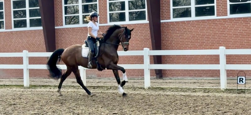 Zum Verkauf steht ein sechsjähriger Wallach von Jovian aus einer Waterford-Mutter, ca. 1,72 m groß, mit hervorragender Perspektive für den Dressursport. Ausbildungsstand • Fünfjährig schonend angeritten • Seit ca. 6 Monaten unter dem Sattel • Aktuell auf Dressurpferde A-Niveau • Sehr rittig und lernwillig • Altersgemäß gefördert, mit klarer positiver Entwicklung Bewegungsqualität • Großer, bergauf gesprungener Galopp mit viel Raumgriff • Ausdrucksstarker, elastischer Trab • Sehr guter, taktsicherer Schritt • Insgesamt drei qualitätsvolle Grundgangarten mit Perspektive Charakter • Sehr brav und unkompliziert im Umgang • Menschenbezogen, aufmerksam und verschmust • Angenehmes Temperament mit guter Arbeitseinstellung Gesundheit • Guter Röntgen-TÜV liegt vor Er präsentiert sich als schicker, moderner Sportpartner mit besten Voraussetzungen für eine erfolgreiche Laufbahn im Dressursport – sowohl für ambitionierte Amateure als auch für fördernde Reiter. Video: https://youtu.be/hMlcVSbY6CE?si=3yDFbh5XGdayQfhR Weitere Informationen oder Probereiten gerne auf Anfrage.