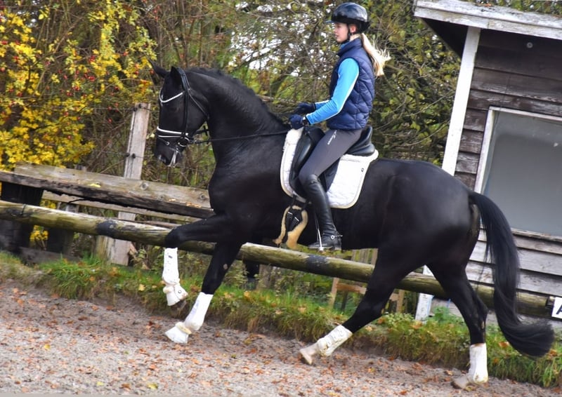 Im Auftrag Wunderschöner 6-jähriger Wallach – 173 cm – bildschöner Rappe mit vier weißen Abzeichen Dieser außergewöhnlich typvolle Wallach besticht nicht nur durch sein edles Erscheinungsbild, sondern vor allem durch seinen liebevollen Charakter und drei herausragende Grundgangarten. Ausbildung Dressurpferde L fertig Dressurpferde M begonnen, Stets motiviert und lernwillig Gänge Schritt: fleißig, taktsicher, mit deutlicher Übertritt Trab: schwungvoll, elastisch und dennoch angenehm zu sitzen Galopp: bergauf, kraftvoll aus der Hinterhand, bestens ausbalanciert Viel Versammlungsmöglichkeiten Interieur & Verhalten Ein absoluter Herzensbube: anhänglich, menschenbezogen und verschmust Kennt Gelände – sowohl allein als auch in der Gruppe Geht Problemlos auf unseren Transporter Schmiedfromm Hält sich täglich mindestens 4 Stunden auf dem Paddock auf, im Sommer Weidegang Gesundheit Regelmäßig geimpft und entwurmt Gepflegte Haltung und sorgfältiges Management Grosse AKU liegt vor Klinisch sowie Röntgologisch mit Beine RÜCKEN.