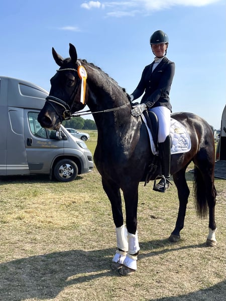 Dear interested buyers, For questions or to schedule an appointment, please send us a WhatsApp or an email. You can reach us by phone on weekdays, preferably around noon. If this is not possible, just send us a message and we will get back to you. We look forward to hearing from you! "Sille" is an absolute charmer, possessing outstanding quality and an incredible work ethic and rideability that every rider desires. With his size, he moves very intelligently and tactically, learning new tasks quickly and with enjoyment. He also behaves exemplary at competitions and has already placed multiple times against strong competition in riding horse tests, dressage horse A, and dressage horse L in the top ranks. He performs lessons such as canter on the outside, half-passes, and canter-walk transitions very reliably. He also executes traverses and flying changes beautifully. At home, he is exclusively ridden by an amateur. He simply wants to do everything right and is also a true friend and very affectionate partner – cuddling and being close is just part of who he is! Since he is very honest, a less experienced rider can also handle him well. He loads easily by himself and is very well-behaved with the farrier. A horse for high-level sport and ambitious riders!