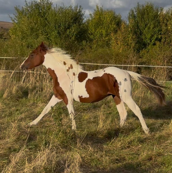Dieser tolle junge 1 jährige Hengst sucht ab sofort ein neues Zuhause . Er wurde am 13.6.24 geboren . Aus eigener Zucht . Farbe Bay . Die letzten Fotos zeigen ihn als Fohlen . Über seinen Vater *DANCING BOYS OKIE* und Mutter *Kiwas little Cheyenne* ist er tobiano homozygot (vererbt immer seine Scheckung) und 7 - fach Panel negativ . Er hat also Reining - und Allround- sowie Cowhorse - Gene . Er wird sicher ein guter Partner im Freizeit Reiten werden . Er wäre aber auch für den Sport offen . Er kennt Hunde , Katzen und auch Lärm von Landmaschinen und zeigt dabei seinen ruhigen Charakter. Er wächst mit anderen Junghengsten auf und war vorher mit seiner Mutter in einer gemischten kleinen Herde auf großen Koppeln . Er gibt brav die Hufe , Hänger ist kein Problem , kennt bereits Fellsattel und leichte Gewichte , ist natürlich Halfterführig, geimpft , entwurmt . Er ist neugierig und offen , bleibt stets gelassen . Er kann natürlich gern besichtigt werden bei ernsthaftem Interesse . Patz vor Preis .