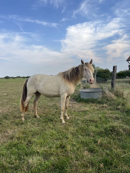 Astéria est une jeune jument qui aura 3 ans en juillet. Race: Palomino Belge Couleur: Champagne Homozygote (test ADN) Taille: pour le moment 1m47, taille adulte probable entre 1m50 et 1m55. C’est une jument douce, calme affectueuse Elle aime le contact humain. Elle est volontaire et aime bien faire. Elle marche bien en main, sait rester attacher. Début d’éducation a pied. Elle vit au pré avec d’autres chevaux. Visible en normandie dans le 27 Pas de confiage Suite à un changement de vie imprévu et le départ sur un autre continent, je lui cherche une nouvelle famille.