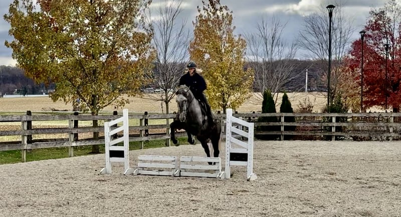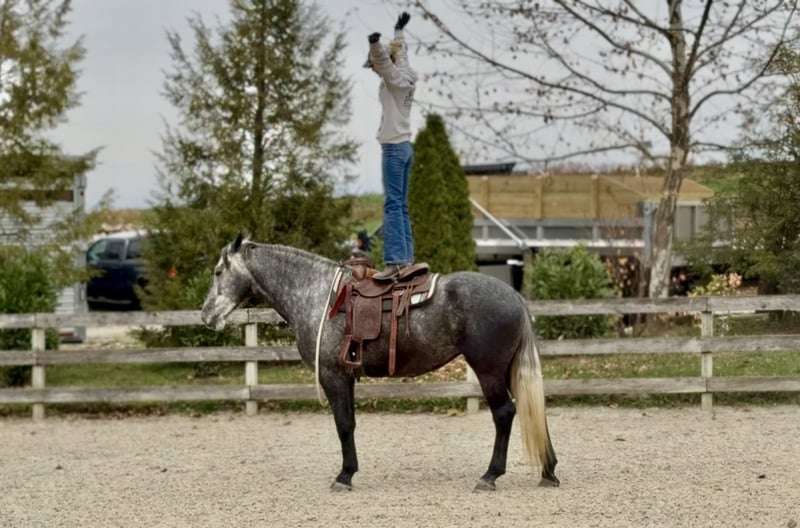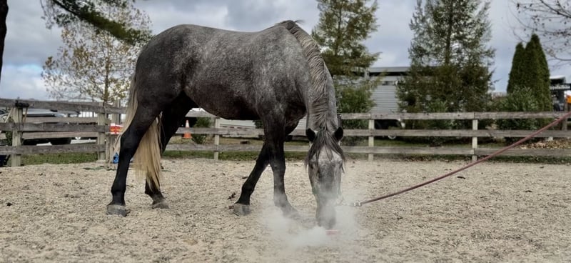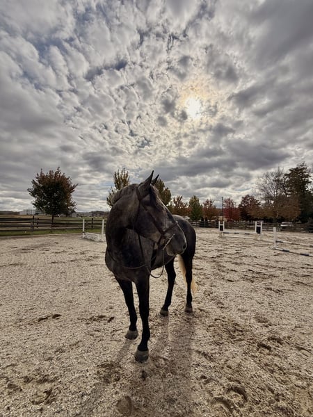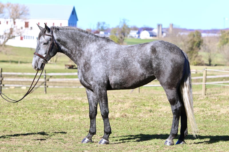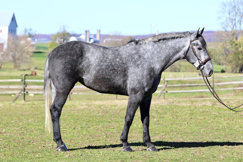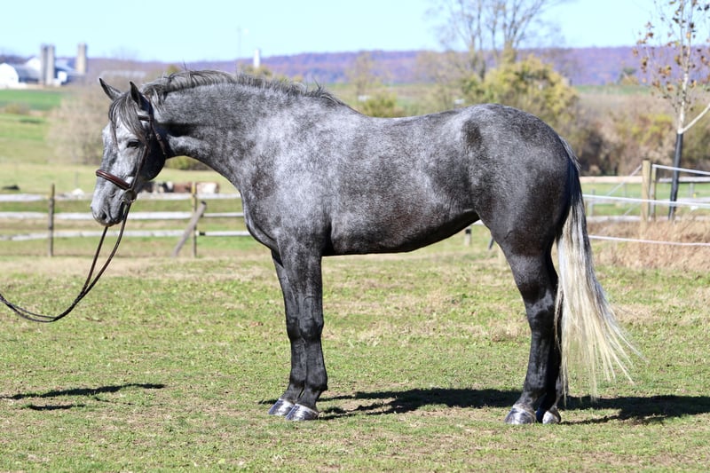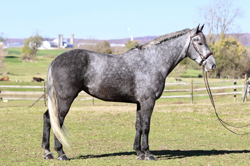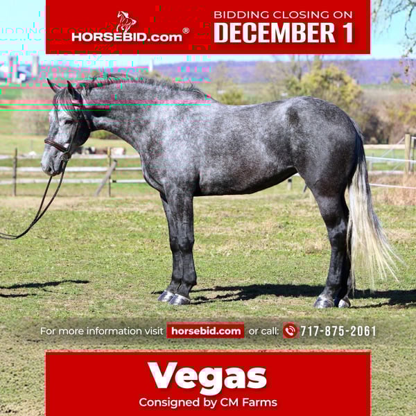 ⚜️ 𝓽𝓱𝓮 𝐇𝐨𝐫𝐬𝐞𝐦𝐚𝐧'𝐬 𝓢𝓱𝓸𝔀𝓬𝓪𝓼𝓮⚜️ Happening now thru MONDAY | DECEMBER 1st - Available EXCLUSIVELY on HorseBid's website! For more details and to register visit: www.Horsebid.com CONSIGNOR CONTACT: CM Farms 717-875-2061 LOCATION: Gap, PA BREED: Perch/QH REGISTERED: No COLOR: Grey HEIGHT: 16.1 AGE: 4 GENDER: Mare Check out this pretty lady! 😍 ✨ Vegas ✨ is a 4-year-old Perch/QHx mare standing right around 16.1–16.2hh. This mare has been blessed in more ways than one. She is sturdy, stunning, and her movement is to die for! She is a lighter, athletic build, making her ideal for people that want the good draft brain—minus the dinner-plate feet. She is broke to ride English, Western, bareback—and she drives single and double. She also lays down on command with an easy cue! In the ring, Vegas is a simple and straightforward ride. She has had an amazing foundation put on her, and she’s ready for any direction you take her. She has one of the best walk-to-canter transitions in the barn, she stops on a dime, and she leg-yields and side-passes. She’s an incredibly fun horse to ride with a comfortable trot and canter. She will extend and collect, she’s very adjustable, she has lovely self-carriage and balance, and she has a good attitude to match! She would kill the game in the dressage arena, cross country, or arena jumping! She has been lightly started over small jumps and has proven to be cute, honest, and athletic. This mare has one of the best brains—you can pull her out when it’s windy and freezing, and she’ll keep her head on her shoulders. She is a rare one, with a steady demeanor that outshines horses twice her age! On the trail, Vegas has some miles under her belt, and she’s a true trailblazer. She goes anywhere you point her—no questions asked! She’s been out on hunter paces with us this fall, and she proved to be the same steady horse in a busy environment. She likes to go out with happy ears forward the whole ride. She’s happy to go anywhere you put her and won’t get upset if another horse gets in her space. She’s been through rocky trails, open fields, through and over bridges, into the creeks and river, and has seen all the wildlife you encounter without so much as batting an eye. She will pop over logs and small fences; she has an easy jump to ride and is guaranteed to get you to the other side. She’s a babysitter when she’s out and would be suitable for a variety of riders. In the barn, Vegas is sweet, mannered, and has zero vices. She is not your typical mare—she gets along with everyone, no drama needed. She stands to clip, bathe, groom, and tack up, and she’s always a lovely lady for the farrier, vet, and dentist. She loves her people and loves scratches so much she’ll make funny faces! Vegas acts the same on property as she does trailered out, and she trailers and loads quietly. She has been through our desensitization program and passed with flying colors. She’s easily a barn favorite here—one you never have to worry about and one we always look forward to working with. If you want a fun, honest, talented young horse to continue bringing along, don’t pass up Miss Vegas!
