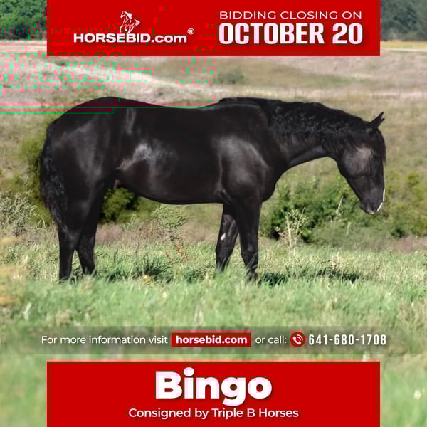 ♦️ 𝐭𝐡𝐞 𝐀𝐌𝐄𝐑𝐈𝐂𝐀𝐍 𝓕𝓪𝓵𝓵 𝓒𝓵𝓪𝓼𝓼𝓲𝓬 ♦️ Happening now thru MONDAY | OCTOBER 20th - Available EXCLUSIVELY on HorseBid's website! For more details and to register visit: www.Horsebid.com CONSIGNOR CONTACT: Triple B Horses 641-680-1707 LOCATION: Plano, IA BREED: Percheron/ Pony cross REGISTERED: No COLOR: Black HEIGHT: 14.3 AGE: 4 GENDER: Gelding Bingo is a 4 year old Percheron pony cross gelding standing 14.3 hands tall. I’ve had a few horses in my lifetime but I’m confident that Bingo has the sweetest personality of them all. He will find you in a big pasture, loves to give kisses, always wants to be in your pocket and loves to play with brushes, ropes, toys, ect. He is very respectful on the ground and under saddle. Typically I’m not one to a day horse this young is “kid safe” but Bingo has the mindset of a 20 year old gelding. Every new thing we have exposed him to he has acted like he has done it a million times! He has never offered to spook, bite, buck, kick, or rear! He will walk, trot, lope both ways with ease. He has a great stop, soft in the mouth, and good with leg pressure. Not only does Bingo ride fantastic but he knows how to lay down! Pick up his left front leg and pull just a little with your right rein and down he goes making for easy mounting or just a cool little trick to show your friends! He is fantastic on the trails and goes everywhere you point him with no hesitation. He dosent try to run up hills, or rush through mud. He has been on several trail rides where one to many adult beverages were involved and he got his rider back to the trailer safely in one piece! He is easy to catch, stands tied, loads good, gets along in a mixed herd. He is 100% sound with a PPE on file performed 10/8/2025! He is current on dental, wormer, and coggins! Very nice young gelding with his whole life ahead of him! Use him on the trails, take him for ranch work, or start him under English the possibilities are endless with this guy!
