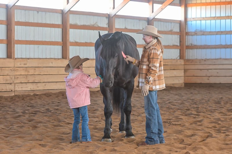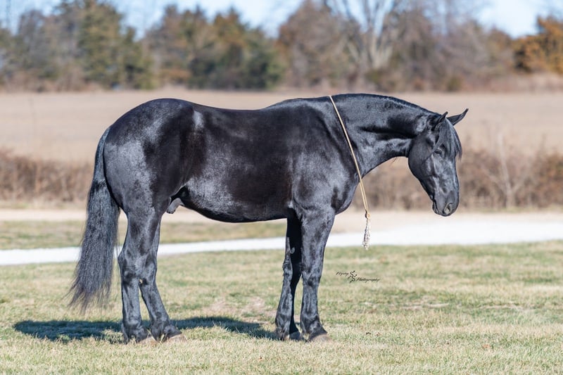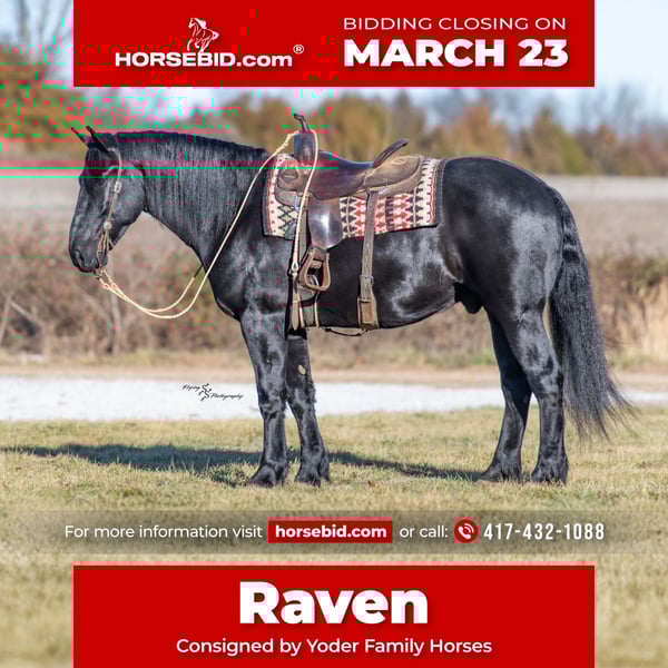 ⚜️𝓽𝓱𝓮 𝐆𝐎𝐋𝐃 𝓢𝓮𝓵𝓮𝓬𝓽⚜️ Happening now thru MONDAY | MARCH 23rd - Available EXCLUSIVELY on HorseBid's website! For more details and to register visit: www.Horsebid.com CONSIGNOR CONTACT: Yoder Family Horses 417-432-1088 LOCATION: Harwood, MO BREED: Percheron x Quarter Horse Crossbred REGISTERED: No REGISTERED NAME: Raven COLOR: Black HEIGHT: 16 AGE: 4 GENDER: Gelding Meet Raven; an exceptionally well-trained crossbred gelding that is a real pleasure to saddle up and ride! Raven is a 2022 model Percheron x Quarter Horse gelding that stands 16h and wears a #4 shoe. He is a true gentle giant that always loves attention, being groomed, saddled and ridden. He has been on our farm approximately one year and has been used for various farm work under harness as a team with other draft horses. Plus, he has been in steady training in our program as a saddle horse for a full year. Raven rides around handier than most crossbreds with a smooth collected trot and lope. He has a nice, steady ground covering walk that is perfect for riding the trails. He lopes even circles, correctly picking up his leads on cue, and has a fantastic stop for a crossbred. Raven is a horse that the entire family can truly enjoy. He has been ridden by complete beginners, young children, and trainers; he gets along with everyone! Raven enjoys trail obstacles and is very confident, steady and surefooted, no matter what you encounter on the trails. If you like a horse that wants to be your buddy each and every day, here he is! He is respectfully in your pocket. Raven is always super easy to catch and has perfect ground manners. He stands patiently to groom, tack, bathe and shoe. He also stands at the mounting block to be mounted or dismounted. He doesn't mind standing tied for hours and loads willingly in a trailer. Raven has always been perfectly sound and healthy; and has no scars, blemishes, or bad habits. He sells 100% sound in every way and even comes with a current Pre-Purchase exam. If you have any questions or would like to meet Raven prior to the auction ending, please CALL us at 417-432-1088.