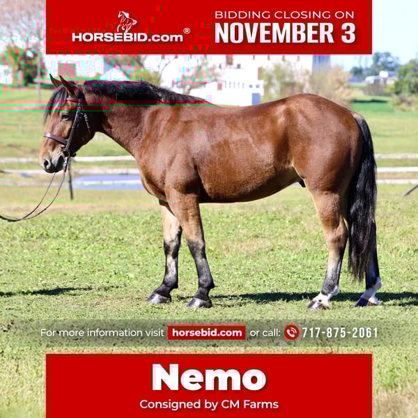 ⚜️𝐓𝐇𝐄 𝐅𝐀𝐋𝐋 𝐇𝐄𝐑𝐈𝐓𝐀𝐆𝐄 𝐂𝐋𝐀𝐒𝐒𝐈𝐂⚜️ Happening now thru MONDAY | NOVEMBER 3rd - Available EXCLUSIVELY on HorseBid's website! For more details and to register visit: www.Horsebid.com CONSIGNOR CONTACT: CM Farms 717-875-2061 LOCATION: Gap, PA BREED: Perch/QHX REGISTERED: No REGISTERED NAME: Nemo COLOR: Bay HEIGHT: 15.2 AGE: 4 GENDER: Gelding Meet ✨Nemo✨ -better known as “old faithful” (despite his age) in our barn. This young gentleman is a 4 year old, 15.2hh, perch/QHx, gelding. Nemo is like the nice guy at school you ignored but he turned out to be the most successful. Nemo has flourished into a handsome young man, with skill and brain to match. He’s not the jock of the barn, but if you want sweet and honest- it’s him. Not only does he drive, but he rides Western, English, Bareback, and he even knows tricks! He will lay down on command with a simple gesture, and while it might not bring you a ribbon in the show ring- it’s definitely a fun party trick to have on hand. The best part about Nemo is that he is SAFE, quite literally for anyone. In the ring, Nemo is quiet, sensible, and has a nice handle to him. It’s hard to find a 4 year old that has the brains and skill he possesses. He spins, sidepasses, leg yields, and is truly so reliable we would trust putting anyone on him. He’s toted around beginners, he is stocky enough for bigger riders, and he’s a saint for leadline with the kids. He has made more people smile than we can count. Whether you’re on his back, or just hanging out with him in the barn-he is guaranteed to make your day better. He is a fun ride, with walk to canter transitions both ways and a sliding stop just off of a simple “whoa” or shift in your seat. He can canter circles, pop over little jumps, or do really anything you ask without hesitation. He’s simple, safe, and rideable in every way. He trailers off property and acts the same as he does at home, and he’ll be the same genuine horse every time you pull him out. He’s sweet as pie, cute as a button, and one of the most honest horses we’ve come across. Always willing to please- and ALWAYS takes care of his rider. On the trail, Nemo will happily mosey behind the group, he’s never in a hurry, and is the type of horse that will remind you to slow down, and enjoy the simplicity’s of life. He’s not lazy, however he won’t go faster than you ask, and he is the type that’s happy to go anywhere you put him in the group. He will respond to cues out anywhere, and has even layed down on a beach and the open fields with multiple different riders! He’s so fun, one you can trust to put that first time rider or a guest on for a hack, and never have to worry. He’s the go-to in our barn for the less confident or beginner riders, and a saint to teach lessons on. Nemo is truly worth his weight in gold, and while he may be a plain bay on the outside, his brain and personality are so unique he is priceless. In the barn, Nemo will stand all day for affection and attention. He will let the kids brush and braid his mane and tail, and won’t move an inch. You can literally crawl underneath him and around his legs and he won’t budge. He’s safe in every aspect, and always behaved. He’s good to tack up, groom, bathe, and for the farrier and vet. He loads into the trailer without hesitation, and is never one to throw a fit or cause drama. He is so special in every way, and we’ve been blessed with our time with him. That being said we know his forever family is out there waiting for him, and we can’t wait to see all the great things he does in the future! Whether that be shows, being a husband/guest horse, or just someone’s best friend we know he will excel in every way. We love this little bay horse and want the best home for our Nemo.
