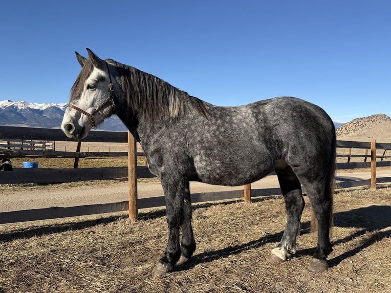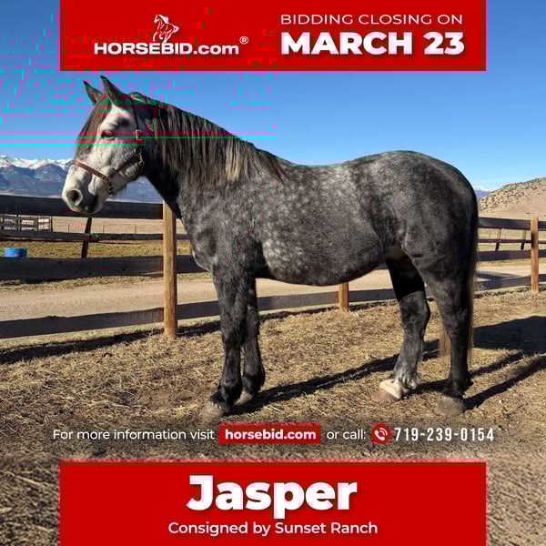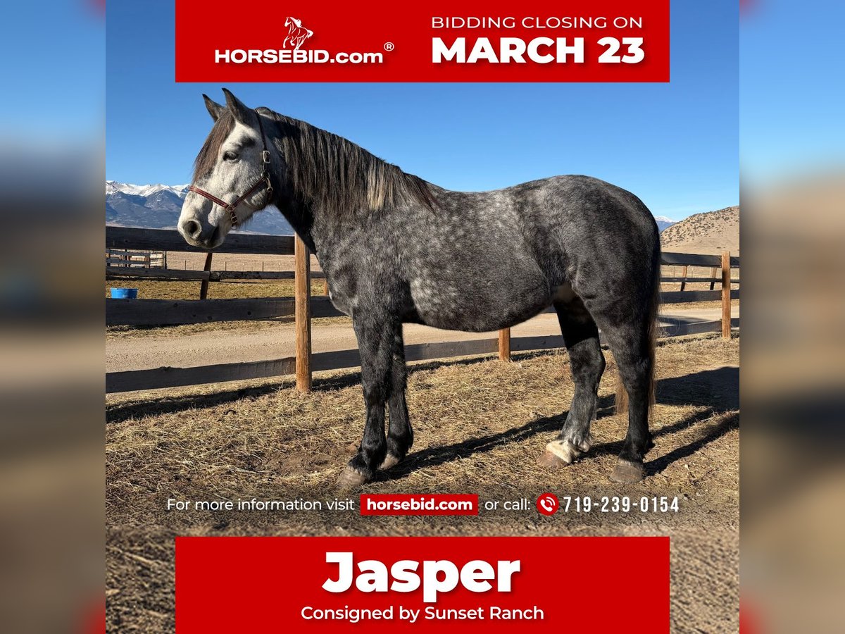 ⚜️𝓽𝓱𝓮 𝐆𝐎𝐋𝐃 𝓢𝓮𝓵𝓮𝓬𝓽⚜️ Happening now thru MONDAY | MARCH 23rd - Available EXCLUSIVELY on HorseBid's website! For more details and to register visit: www.Horsebid.com CONSIGNOR CONTACT: Sunset Ranch 719-239-0154 LOCATION: Westcliffe, CO BREED: Percheron Quarter Cross REGISTERED: No COLOR: Gray HEIGHT: 16 AGE: 5 GENDER: Gelding Jasper is a super safe, easy going, sweet tempered gentleman! He will take you wherever you need to go with no fuss! He has been in the mountain trails, crosses creeks, bridges, obstacle courses, flags, tarps, roping the dummy, has been used around heavy equipment, traffic safe, he has been there done that! A true gentleman!