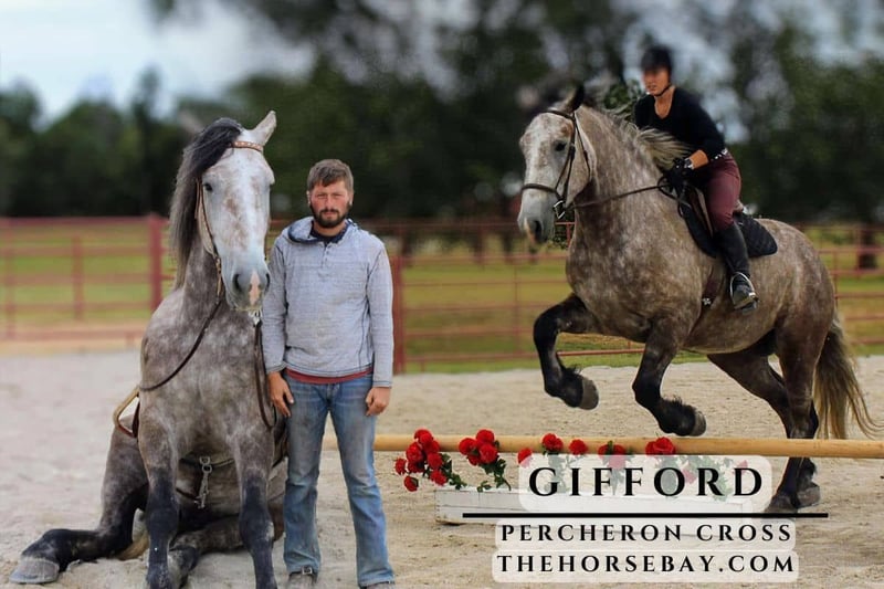 JUMPS + TRAFFIC SAFE + ENGLISH + WESTERN + SITS + LAYS DOWN + WORKS CATTLE + STEPS TO MOUNTING + DRIVES SINGLE & DOUBLE + TRAIL + PULLS “Gifford” is a five-year-old Percheron gelding, standing a stout 16.3 hh. Absolutely safe for the whole family! Athletic enough for the fun stuff, quiet enough for the husband! Gifford was raised and started by a great Amish family. Then I purchased him and started putting lots of outside miles on trails, jumps, highways, and dirt roads in town and country on him. He also drives single & double, 100% traffic-safe! Gifford has been exposed to tarps, whips, balls, dogs, cats, ducks, sheep, goats & chickens and has been ridden around 4-wheelers, ATVs, etc.! Gifford leads, loads, and ties as he should, with absolutely no holes, vices, issues, or blemishes! He is smooth at all gates! Gifford has been ridden in an arena setting. He is outstanding in both English and Western. He also stands perfect for a farrier. Gifford has a few neat tricks! He can lie down and sit like a loving puppy. He will set up over to the mounting block. You can pull from the saddle horn with Gifford! Nothing will shake him. He has been used extensively on cattle, penning back at a sale barn. Gifford loves people; he is a big, kind teddy bear! He lives in a dry lot with good grass, a round bale, and a chunk of alfalfa in the morning. He never has any known soundness or sickness issues, has a fresh wellness check, has a negative Coggins, and has teeth floated.
