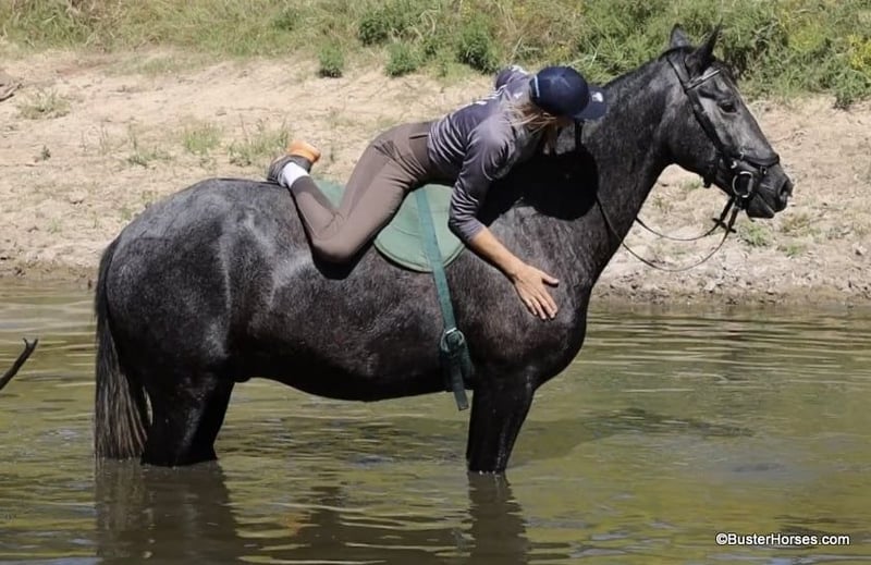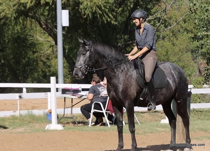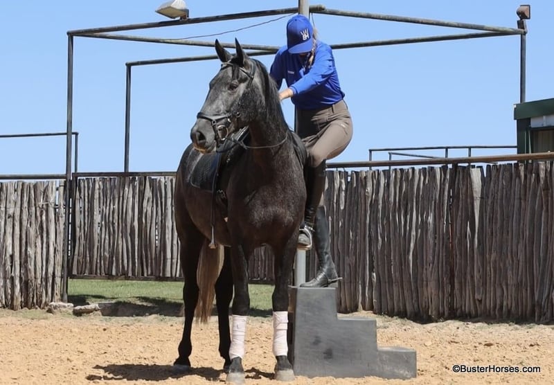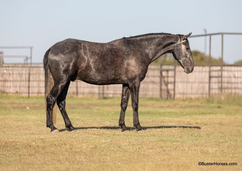 ONLINE AUCTION Place your bids at www.PlatinumEquineAuction.com Starting Bid $3500 Auction ends November 3rd, 2024 Need a new saddle? Check out White Rock Saddles on our website or Facebook! “Georgie” – 16.1H, 4 year old gray Lusitano / Percheron / Quarter horse cross gelding. Georgie is exceptional and is going to make someone a once in a lifetime “heart” horse. He has a big goofy personality and is super sweet, affectionate, loving, and kind. He is a big fresh clean slate. He has been in exceptionally good hands and is ready to finish your way. He was started outside and he has had tons of big open using miles covering ground on a big piece of land letting him mentally and physically mature and he is mature beyond his years and very solid minded. He is a very talented mover and would be a great event prospect, dressage prospect,.or could be finished out to go to the hunter jumper shows as well. We have hauled him out to schooling shows and he hops right on the trailer and stands tied next to the trail like a seasoned professional – even when left tied alone! He is very relaxed in new environments and is happy to see the new sites and sounds. He is a pleasant horse – always nice to be around and to have along with you. He is never worried whatsoever – he is relaxed, no drama, and no hassle. He is very suitable for a youth or amateur rider to season and finish on their own underneath a trainer. He is an easy uncomplicated ride and has big balanced comfortable smooth gaits. He is great to be around on the ground good with his feet easy to shoot easy to clip bathe saddle bridle and stands very relaxed for Mount and dismount. He loves to go out on the trail and rides very comfortably bareback. He adores the creek and the pond! Check out his videos and don’t miss out on a horse that will last someone a lifetime. He is just now maturing into his legs and we cannot wait to see what the source looks like as a fully mature 6 year old! He is already so naturally balanced and such a big floatey mover! To see additional videos, go to our website: BusterHorses.com or our Facebook page Buster Horses Please call anytime for more information at Buster Horses Ashley 214-605-7174 Georgie is located in Weatherford, TX – one hour from Dallas / Fort Worth International Airport. He is an easy day trip or fun overnight trip to come try out, from anywhere! We are experienced, knowledgeable sellers, and we can help with quickly arranging affordable shipping to any buyer’s location – we have experience shipping worldwide – including regularly to Hawaii, Canada, Mexico, Europe, and South Africa. ONLINE AUCTION Place your bids at www.PlatinumEquineAuction.com Starting Bid $3500 Auction ends November 3rd, 2024 Need a new saddle? Check out White Rock Saddles on our website or Facebook!