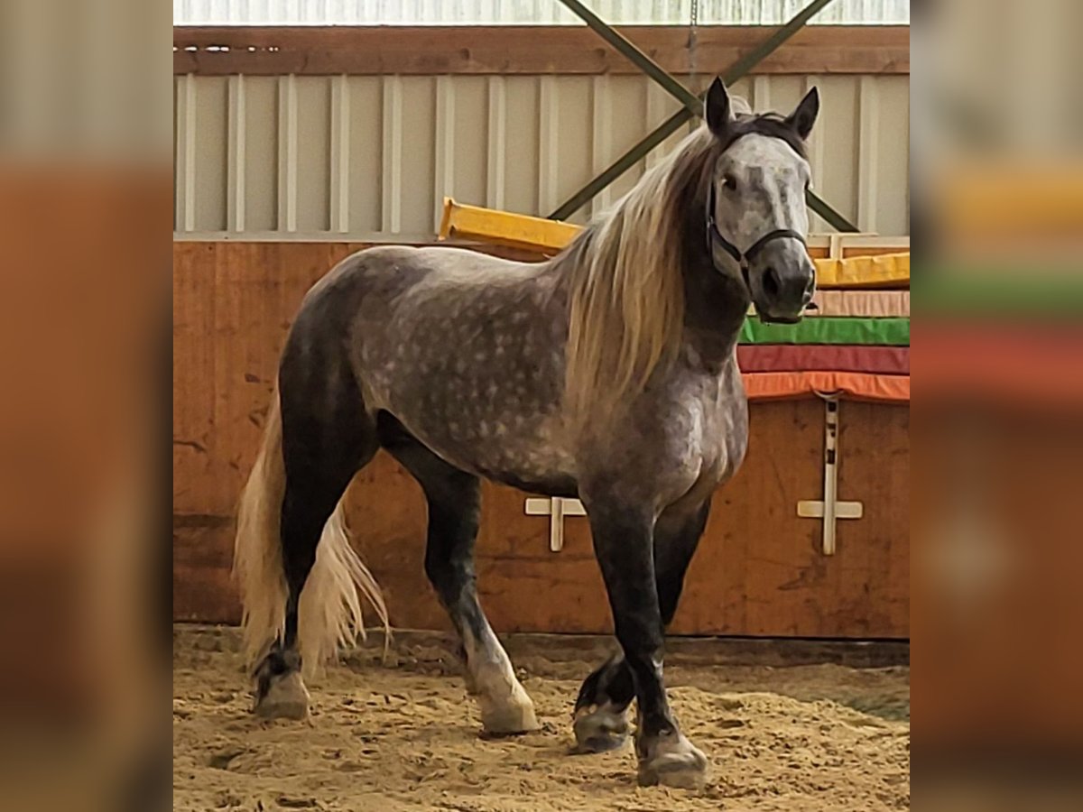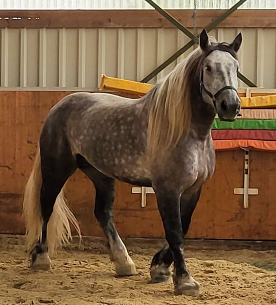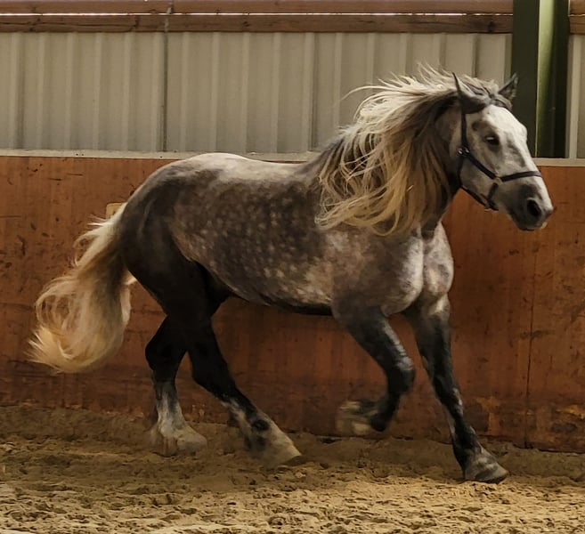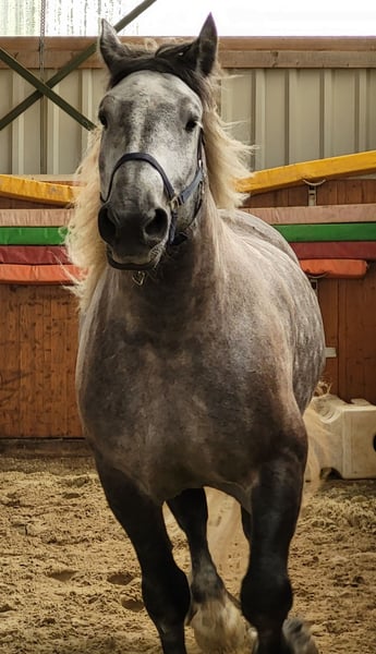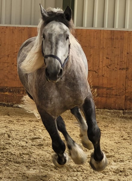The Elfchen is looking for a riding partner. He is located in Miel/Swisttal. The Elfchen is a Percheron with a height of 1.80m and weighs nearly 800 kg. He loves dressage and wants to be encouraged. Lateral movements and cantering from a standstill and walk are no problem. His favorite gait is the gallop. Running in circles is boring for him; he doesn't engage much with groundwork. When he gets bored, he comes up with his own ideas, never mean, but creative. That's when his Arabian side comes out. You should be able to handle a cold-blooded head. You should also be secure in the saddle, as he doesn't buck but just gives a little speed. Spurs and "whip training" are not part of our routine. This young man prefers cuddling and doesn’t understand that he doesn’t fit on your lap. We are looking for someone who can reliably care for him two to three times a week. This can involve riding, but also groundwork in the lunge arena or going for walks. Additionally, the paddock that belongs to his box needs to be cleaned, and the hay bag for lunch needs to be filled.