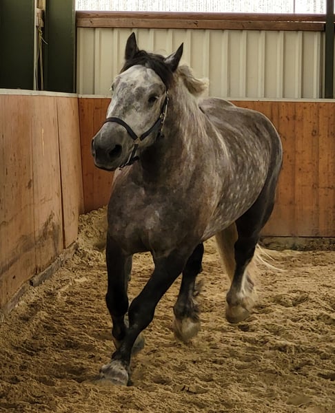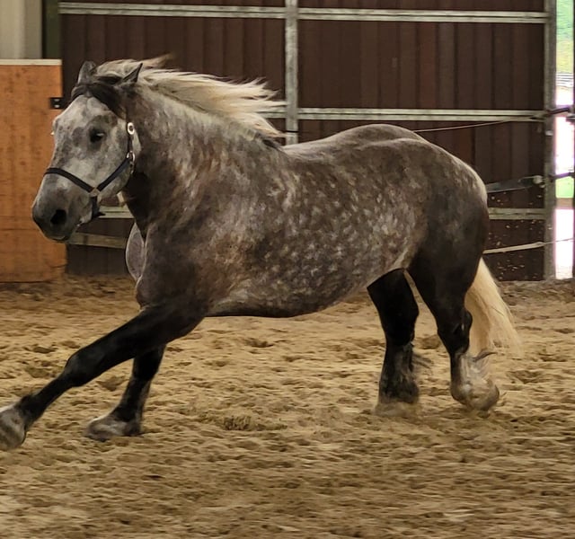 Das Elfchen sucht eine Reitbeteiligung. Er steht in Miel/Swisttal. Das Elfchen ist ein Percheron mit Stockmass 1.80m und knapp 800 kg Gewicht. Er liebt Dressur und möchte gefördert werden. Seitswärtsgänge und Angaloppieren aus Stand und Schritt sind kein Problem. Lieblingsgangart ist Galopp. Im Kreis laufen ist langweilig, mit Bodenarbeit kann er nicht viel anfangen. Wenn es langweilig für ihn wird, kommt er auf eigene Ideen, nie böse, aber kreativ. Da kommt dann das Arabergen zum Vorschein. Du solltest in der Lage sein, mit einem Kaltisturkopf umgehen zu können. Sattelfest solltest Du auch sein, wobei er nicht buckelt, sondern einfach mal Speed gibt. Sporen und "Gertenerziehung" gibt es bei uns nicht. Der junge Mann steht eher auf Knuddeln und versteht nicht, dass er nicht auf den Schoss passt. Wir suchen jemanden, der sich zuverlässig zwei bis dreimal die Woche um ihn kümmert. Das kann Reiten sein, aber auch Freiarbeit in der Longierhalle oder Spazierengehen. Darüber hinaus ist der Paddock, der zu seiner Box gehört, zu säubern und der Heusack fürs Mittagessen zu befüllen.