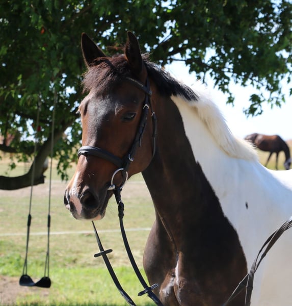 For sale is this 2011-born pinto mare, suitable as a family horse, for leisure riding, breeding, or moderate sport use. She is also of interest for breeding, having produced two offspring so far, both of which have won up to Jumping Horse A with scores of 8. Gentle enough for children to ride and handle. Due to health issues (developing vertebral problems in the back), she is being offered at a significantly reduced price. Farrier and loading friendly. Herd compatible.