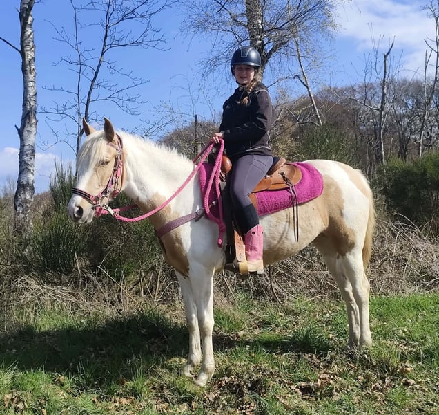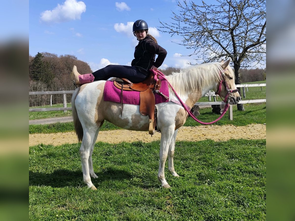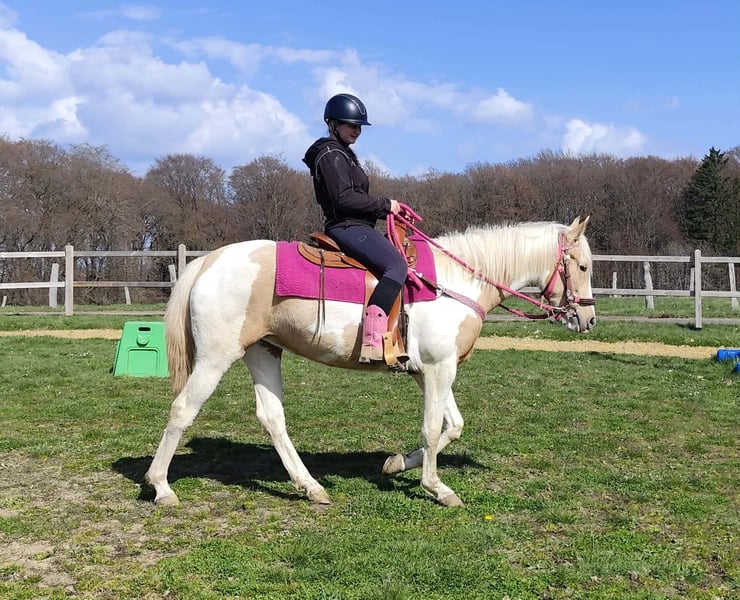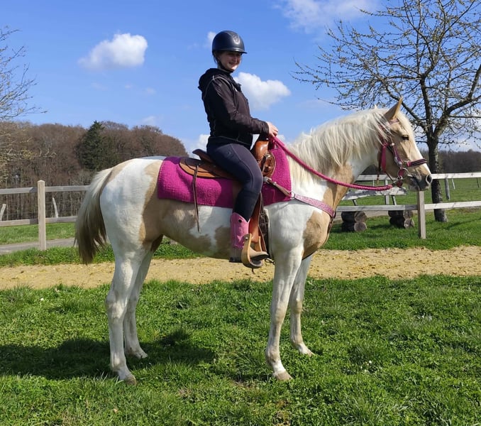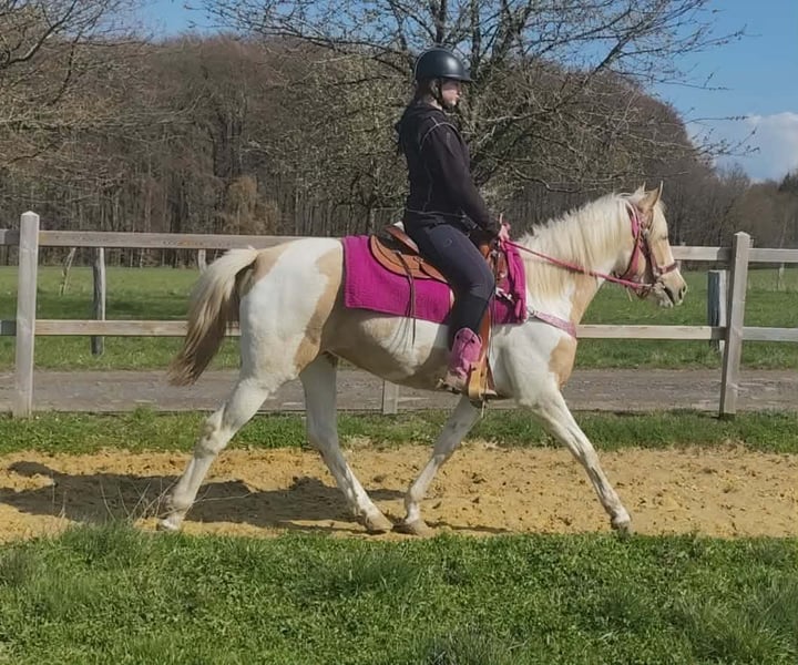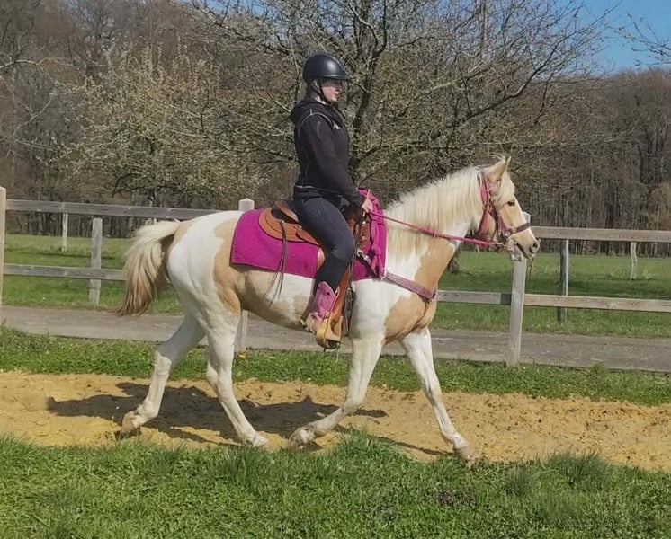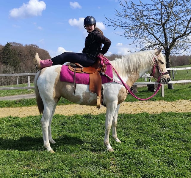 Palomino-Scheck Stute – lieb, zuverlässig & unkompliziert Name: Estrella Alter: 4 Jahre Stockmaß: ca. 1,55 m Preis:6800 AKU : Vorhanden Beschreibung: Estrella ist eine wunderschöne Palomino-Scheck Stute mit einem besonders freundlichen und ausgeglichenen Charakter. Im täglichen Umgang zeigt sie sich sehr brav, ruhig und absolut unkompliziert. Sie ist menschenbezogen, aufmerksam und lässt sich angenehm handeln. Auch unter dem Sattel überzeugt sie durch ihre Gelassenheit und Zuverlässigkeit. Estrella ist einfach zu reiten, arbeitet motiviert mit und gibt ihrem Reiter stets ein sicheres Gefühl. Für ihr junges Alter bringt sie bereits eine tolle Einstellung und viel Nervenstärke mit. Perfekt für: Reiterinnen und Reiter, die eine liebe, ehrliche und unkomplizierte Stute suchen – ideal für Freizeit, Ausritte und weitere Förderung. Pflege & Betreuung: – Regelmäßig entwurmt – Schmied gepflegt – Osteopathisch betreut Zusatzangebote: Westernsättel, Trensen und weiteres Zubehör erhältlich. Service: – Transport kann organisiert werden – 3 Monate Umtauschrecht Proberitt: – 35 € (jedes weitere Pferd 25 €) – Wird beim Kauf am selben Tag angerechnet Preisnachlass bei sofortiger Mitnahme oder Transport am gleichen Tag: – Kategorie 1: 100 € – Kategorie 2 (ab 5.000 €): 250 € Telefon: 0171 – 4001968 Täglich erreichbar von 8–20 Uhr Keine E-Mail oder WhatsApp Alle Angaben ohne Gewähr
