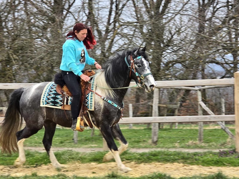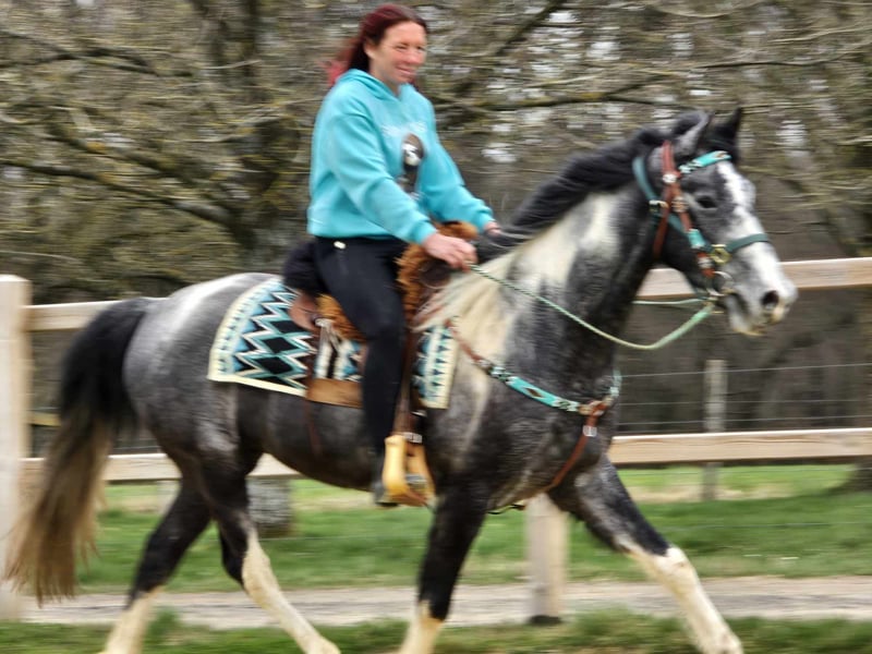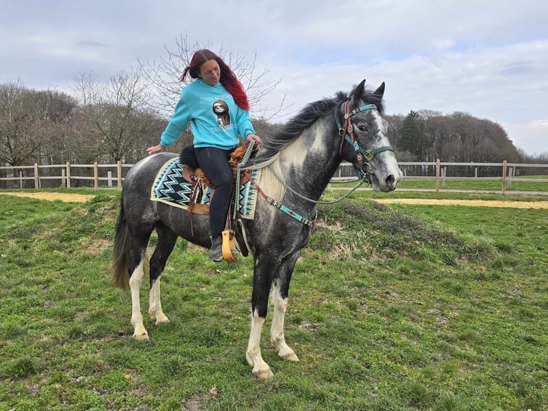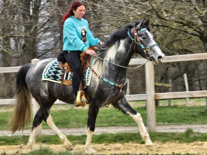 Piebald Gelding – friendly, outgoing, and eager to learn Age: 4 years (born in 2022) Height: approximately 15.7 hh Price: €6,500 Health certificate: available ✨ Description: A stunning piebald gelding with a very friendly, open personality. He is well-behaved, personable, and particularly affectionate in daily handling. As a young gelding, he is curious, attentive, and always easy to manage. He is already backed and eager to please his rider. He works with motivation, shows a willingness to learn, and approaches work with a positive attitude. Despite his young age, he is uncomplicated and straightforward. A young partner ready to explore the world together with his human. Ideal for: Riders seeking a friendly, honest, and motivated young gelding. Suitable for leisure riding, further training, and versatile use. Perfect for those who enjoy developing a young horse. Our horses are regularly: – dewormed – handled by the farrier – osteopathically checked On-site shop: Western saddles, bridles, and accessories Transport and equipment can be organized affordably upon request. Our services include: ✅ 3-month exchange guarantee ✅ Test ride: €35, each additional horse €25 (credited on the day of purchase) ✅ €100 immediate discount for pickup/transport on the same day ✅ Personal and honest advice Please inquire exclusively by phone: 0171 – 4001968 Available daily from 8 a.m. to 8 p.m. ⚠️ No emails or WhatsApp messages ⚠️ All information provided without guarantee