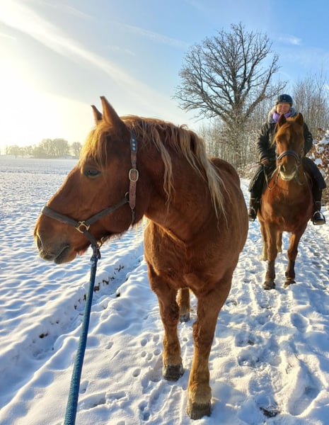 Buzi wurde am 1. November 2017 geboren und lebt bei mir seit er 3,5 Jahre alt ist. Stockmaß ca. 155 cm Buzi ist ein sehr anhänglicher lieber Wallach, der seinen Menschen sucht. Grundausbildung zusammen mit horsemanship Trainer. Buzi wird hauptsächlich im Gelände geritten. Sowohl in der Gruppe als auch alleine. Er ist ein fleißiges Kaltblut, das auf feine Hilfen reagiert. Er hat schöne weiche Gänge, die angenehm zu sitzen sind. Schöner Galopp. Sehr motiviert zeigt sich Buzi bei der Bodenarbeit. Es macht Spaß, mit ihm Seitengänge zu üben (vom Boden und geritten). Er arbeitet auch super an verschiedenen Stangenkombis im Schritt und Trab. Buzi ist im regelmäßigen ausgewogenen Training. Er ist gut bemuskelt, hat eine gute Kondition und läuft bei mir problemlos Halbtagsritte mit. Ich verkaufe ihn, weil er für meinen kleinen Wanderreit Betrieb zu sensibel ist. Buzi ist einfach kein Pferd für jedermann. Als sensibles Kerlchen braucht er einen routinierten Pferdemenschen, der ihm Sicherheit und Vertrauen geben kann. Ängstliche unsichere Reiter bringen ihn aus dem Konzept. Meine coolen gelassen Reiter hingegen kommen prima mit ihm zurecht. Buzi lebt in einer gemischten Offenstallherde. Offenstall Haltung wäre wünschenswert. Es kann ein angepasster Wanderreitsattel (Marke Sommer, Modell Spirit) sowie ein Biothane Wanderreittrense zusätzlich erworben werden. Gerne einfach nachfragen.