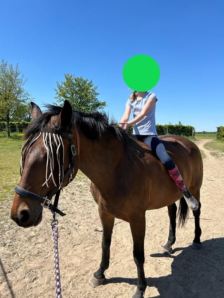 18-year-old, sweet and reliable mare. Very people-oriented and well-behaved, she adapts well to varying herd groups. Currently kept outdoors 24/7. She can no longer be ridden intensively but would enjoy light recreational riding or walks; she still has a good work ethic. Also suitable as a companion for grazing. An extremely easy horse to handle, calm during transport and grooming, including with the farrier and veterinarian. She is barefoot and shows no signs of lameness. Respectful towards the rider. Does not buck or rear. Previously participated in group lessons and tolerates beginner riders. Has a mild form of summer eczema. Up to date with vaccinations.