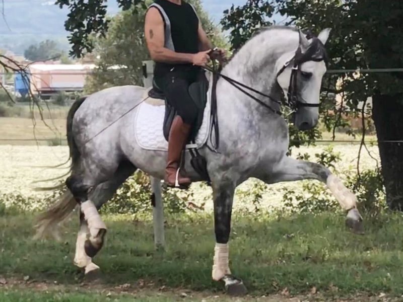 We would like to share with you an exceptional PRE stallion of Miura lines, ridden at medium level. With three good gaits, he is gifted with an expressive trot and with a lot of knee lift, his stride is wide and sure, where he goes well over the hand print, with active and strong feet, and to top it all off he has a comfortable and pleasant canter. He does lateral work, elegant pirouettes and three-stroke foot changes, but what is most remarkable is his ease of riding and the goodness of his character. He is used to working outside the arena but also likes to go out in the field. He is a sociable and calm stallion who enjoys breaking the monotony of working in the arena. With good value for money, this horse can be your life partner as soon as you make the decision to have a Spanish horse with a promising future.