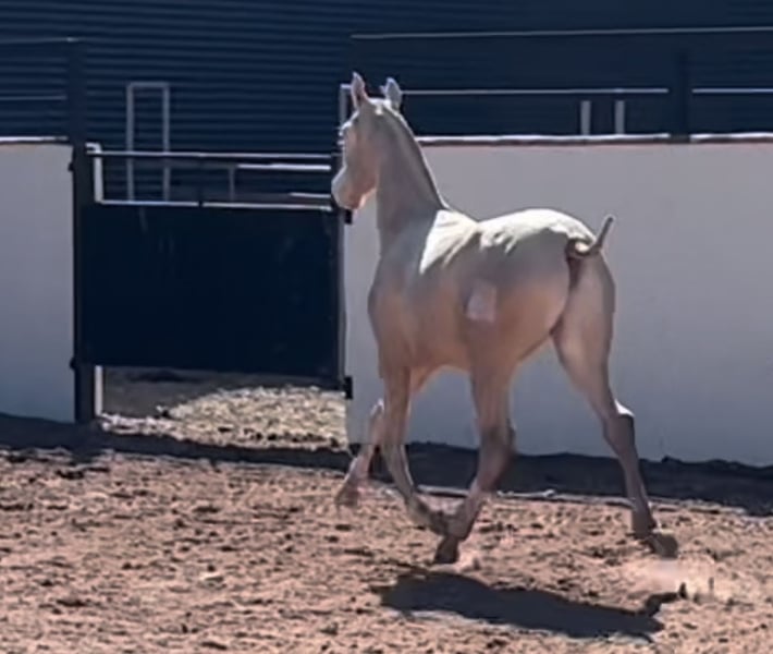 Excellent opportunity to acquire a future top P.R.E. stallion — perlino, with a striking face and a quateral coat, the most exclusive in diluted color. The foal has just turned 9 months old, with a very good conformation — strong and broad, with good proportions and soundness. His movements are highly expressive and artistic, indicating a promising future in haute école and performances, as well as for working equitation, breeding, and as a sire to establish a breeding program. He is sired by Inedit II, a cremello stallion standing at 1.73 meters. Located in Castellón, near Valencia, Spain.