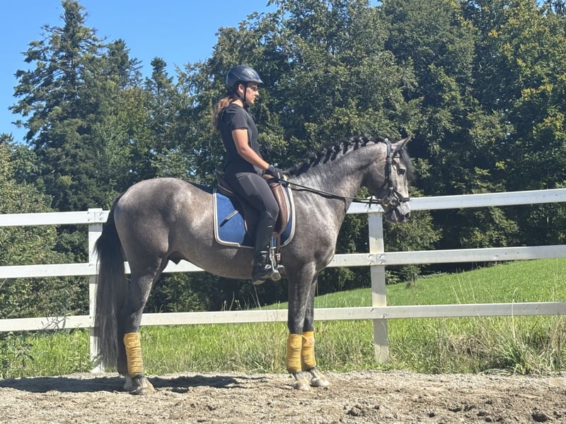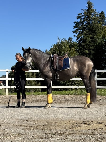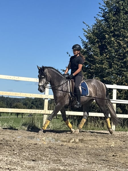 SIR SH è un affettuoso spagnolo come erano una volta. Con i suoi delicati tre anni, si mostra molto disposto ad apprendere e affidabile. Porta il suo cavaliere con la massima fiducia ed è pronto a entrare nella vita del cavallo da sella. La sua formazione di base avviene in modo delicato e affettuoso. Si presenta con un bellissimo manto grigio scuro e ha un'altezza finale stimata di 163 cm. Questo affascinante stallone in mantello barocco è adatto per attività versatili. Si mostra sempre curioso, coraggioso, amichevole, affettuoso e molto legato all'uomo. Da menzionare sono i suoi passi di base orientati alla dressage. È ben educato e ha già accumulato le prime esperienze sotto sella. Con il suo fascino e il suo potenziale, è il partner perfetto per i cavalieri che cercano un compagno affidabile per il tempo libero. Se stai cercando un giovane cavallo di talento che affascina sia per il suo aspetto che per il suo carattere e la sua salute, allora potrebbe essere proprio quello giusto per te. SIR SH è cresciuto in modo appropriato dal suo allevatore in Galizia ed è stato felice di muoversi in un ambiente di branco su ampie aree. Qui si presta grande attenzione a una buona gestione dell'alimentazione e a sverminazioni regolari. Anche gli zoccoli vengono controllati regolarmente e trattati se necessario. Non ha mai avuto esperienze negative, quindi ripone tutta la sua fiducia nell'uomo. Informazioni generali per conoscere i nostri cavalli: I cavalli sono per lo più allo stato brado o già montati con delicatezza fino al loro arrivo da noi. Ci impegniamo al massimo per introdurre i cavalli nella vita del cavallo da sella in modo fiducioso. Presentiamo volentieri i cavalli alla longe e sotto il cavaliere. In caso di interesse serio all'acquisto, è possibile anche provare a montare e lavorare da terra. Durante il periodo di visita, è prevista una tassa di protezione di 50 euro per visita. In questo modo proteggiamo i nostri cavalli in vendita dal turismo di prova diventato di moda. Abbiamo riscontrato che i nostri acquirenti di cavalli sono grati che il loro futuro cavallo non sia stato provato da troppe mani. Grazie per la vostra comprensione. Puoi anche combinare la tua ricerca di cavalli con qualche giorno di vacanza. I nostri accoglienti appartamenti per le vacanze direttamente nell'allevamento ti permettono di conoscere i cavalli 24 ore su 24. Per ulteriori informazioni o per fissare un appuntamento per una visita, ti preghiamo di contattarci. Non vediamo l'ora di sentirti! Se sei interessato o hai ulteriori domande, attendo il tuo messaggio!