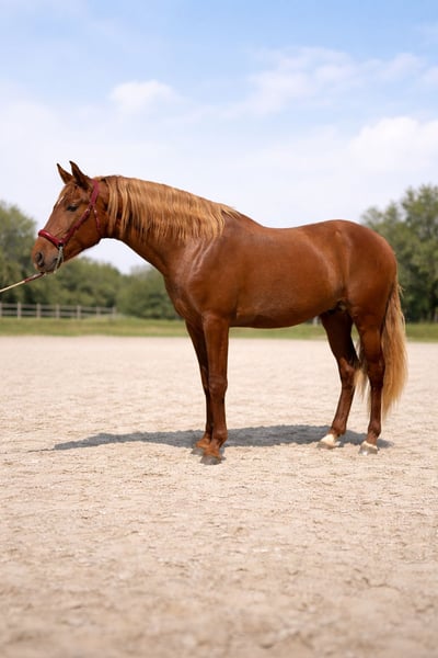 3-Year-Old Chestnut Stallion This attractive 3-year-old chestnut stallion impresses with his balanced conformation, expressive movement, and friendly character. He presents himself with a natural elegance and shows promising potential for further training in various disciplines. The stallion is well-handled for his age, displays a willing attitude, and is eager to learn. His correct gaits and active hindquarters make him an interesting prospect for sport or leisure riding. With his charming presence and good temperament, he is suitable for riders looking for a young horse to develop further. A great opportunity to acquire a quality youngster with a bright future ahead.