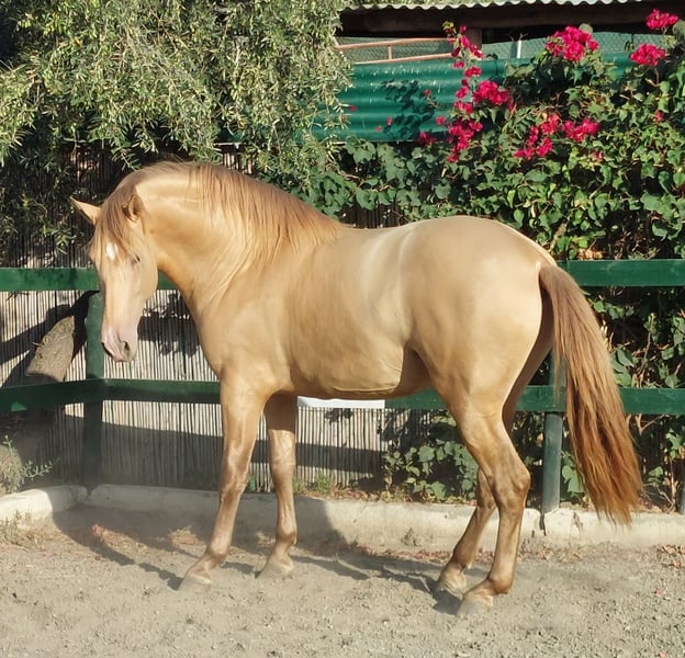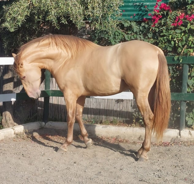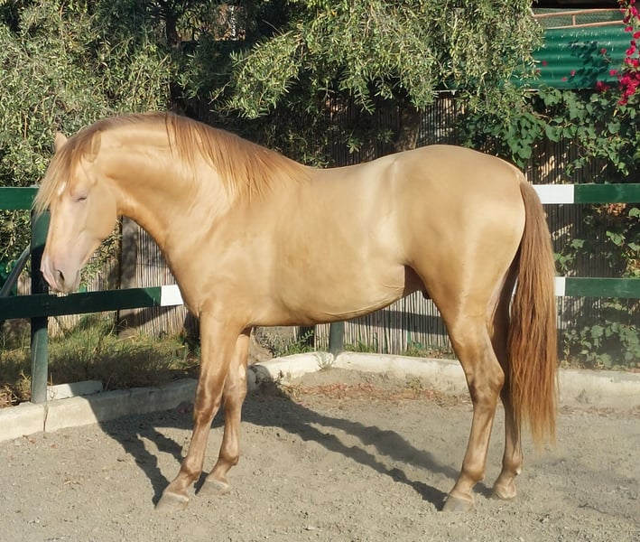 PUR RACE ESPAGNOLE de couleur ISABELLE. Ligne de champions par INEDITO, champion d'Espagne. Idéal comme étalon pour la reproduction. Beauté, Noblesse, Bons mouvements dans les trois allures : pas, trot et galop. Couleur génétique : gg eE aA Prl. Prl.