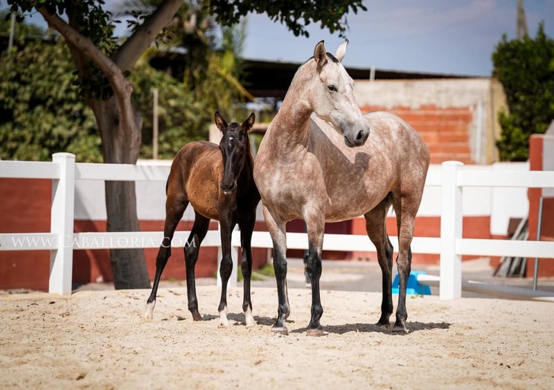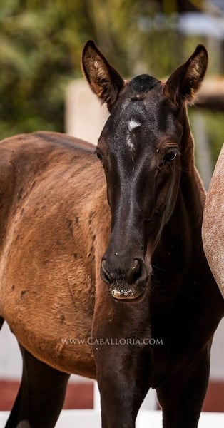 Potro: Tamaño: El potro ya ha alcanzado la impresionante altura de 135 cm. Genética: Debido a su pedigrí, el potro es portador de interesantes rasgos genéticos. Mientras que su madre tiene un gen PRL, el padre hereda dos genes Prl. Apariencia y andadura: Este potro PRE negro no sólo impresiona por su complexión atlética, sino también por una andadura elegante y fluida que será una ventaja en doma y otras disciplinas. Cara: Una característica especial del potro es su cara fina y hermosa, que le hace parecer especialmente expresivo y derrite todos los corazones. Versatilidad: A pesar de su corta edad, el potro ya demuestra que está preparado para todos los ámbitos de la vida, ya sea en el deporte, el ocio o simplemente como fiel compañero. En resumen, este potro no sólo es genéticamente interesante, sino también un animal joven y prometedor con rasgos físicos y de carácter sobresalientes. Tiene potencial para destacar en muchos ámbitos diferentes del deporte ecuestre y más allá.