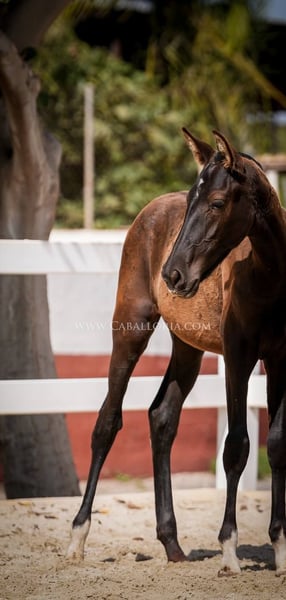 Veulen: Grootte: Het veulen heeft al een indrukwekkende hoogte van 135 cm bereikt. Genetica: Door zijn afstamming heeft het veulen interessante genetische eigenschappen. Terwijl zijn moeder één PRL-gen heeft, erft zijn vader twee Prl-genen. Uiterlijk en gang: Dit PRE zwarte veulen maakt niet alleen indruk met een atletische lichaamsbouw, maar ook met een elegante en vloeiende gang, wat een voordeel zal zijn in dressuur en andere disciplines. Gezicht: Een bijzonder kenmerk van het veulen is het fijne en mooie gezicht, waardoor het bijzonder expressief overkomt en elk hart doet smelten. Veelzijdigheid: Ondanks zijn jonge leeftijd laat het veulen nu al zien dat het klaar is voor alle aspecten van het leven, of het nu gaat om sport, vrije tijd of gewoon als trouwe metgezel. Samengevat is dit veulen niet alleen genetisch interessant, maar ook een veelbelovend jong dier met uitstekende fysieke en karaktereigenschappen. Het heeft de potentie om uit te blinken op veel verschillende gebieden van de paardensport en daarbuiten.