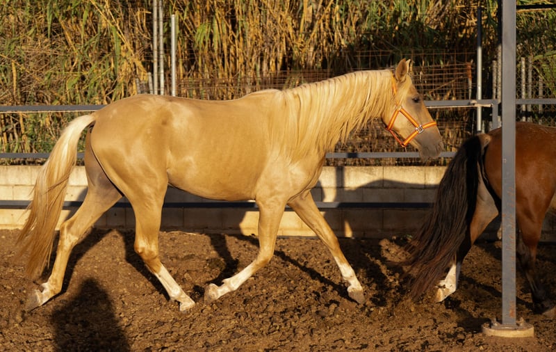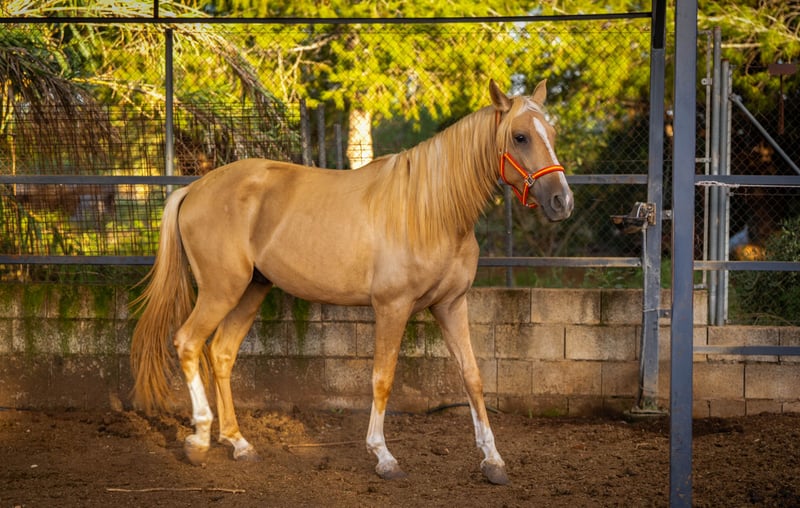 Breed: PRE Type: Warmblood Gender: Stallion Age: 3 years Height: 156 cm Color: Palomino Main Discipline: Dressage Other Disciplines: Working Equitation, Baroque, Leisure Breeding Association: Asociación Nacional de Criadores de Caballos de Pura Raza Española (ANCCE) Additional Features: - Raw - Allrounder - Barefoot - Free from eczema - free from Pyroplasmosis Quimba – a 2-year-old PRE colt captivates with his striking blaze and four white legs. His outgoing and affectionate nature makes him a true treasure. He loves to cuddle and always approaches you joyfully. Especially in the morning during feeding, he greets you with an early whinny. Playful and curious, Quimba is familiar with handling electric fences. In the herd, he is rather low-ranking, yet he remains friendly and does not let others bother him. His father is the beautiful cremello stallion Kefir JL (seen in the last picture), which underscores his impressive lineage. Quimba is a wonderful companion for anyone looking for a loving and playful horse. More information available upon request!