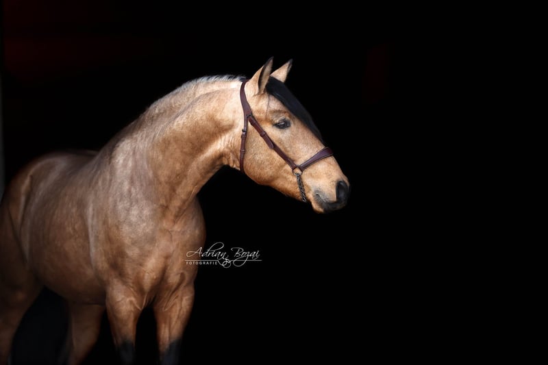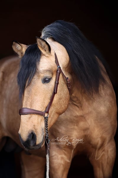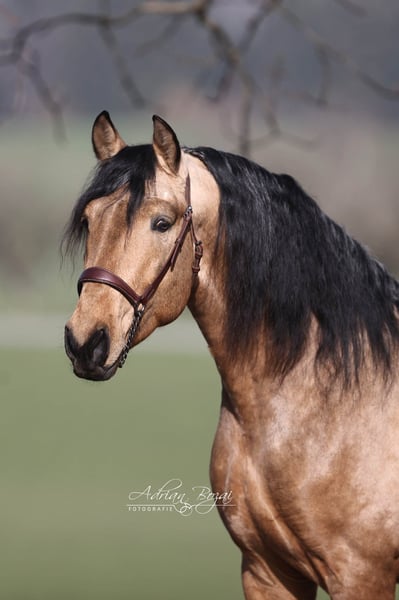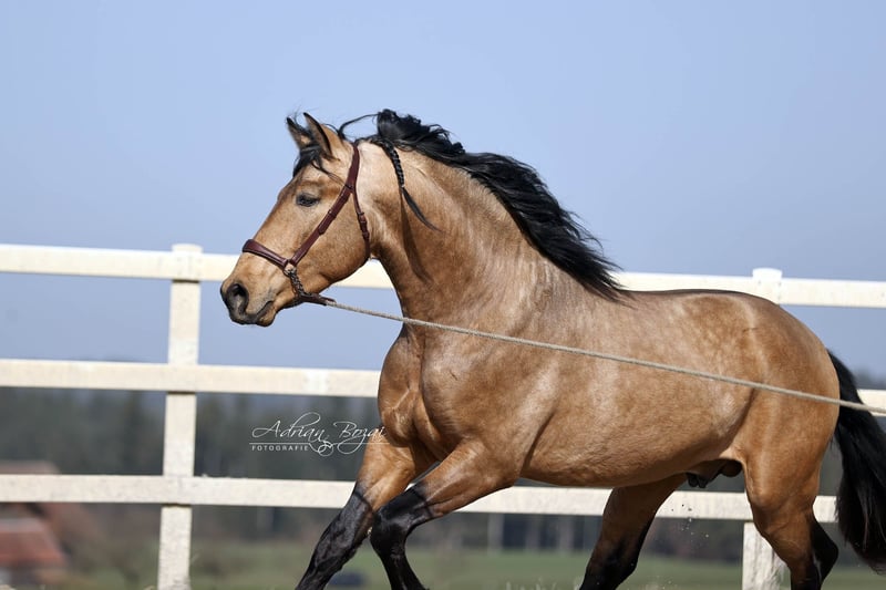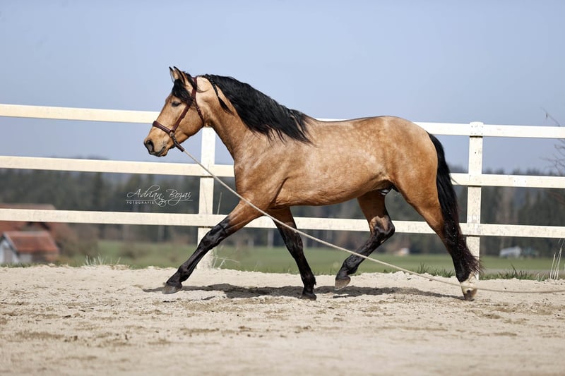 **Verkaufsanzeige: Vielversprechender Falbe aus dem Jahrgang 2022** SIMBAD SH, ein Hengst wie aus dem Bilderbuch, der ausdrucksstarke Pura Raza Española besticht durch seine ansprechende Erscheinung und sein harmonisches Exterieur. Mit einem geschätzten Endstockmaß von von 163-165 cm verfügt er über eine praktische Größe, die ihn sowohl im sportlichen Einsatz als auch in der Freizeitreiterei vielseitig einsetzbar macht. Der junge Hengst wurde bereits schonend von Frauenhand eingeritten und zeigt viel Talent für eine vielseitige Ausbildung. Seine Bewegungen sind für ein spanisches Pferd extrem gut, im Schritt tritt er 3-4 Huf breit über, sein Galopp ist von hoher Qualität und der Trab taktklar und reell, einfach gut ! Somit bietet er ideale Voraussetzungen für den sportlich ambitionierten Reiter. Durch seine neugierige Art und sein freundliches und auch selbstsicheres Wesen ist er sowohl für erfahrene Reiter als auch für ambitionierte Freizeitreiter geeignet. Zu erwähnen ist seine gute Hufstellung und die Tatsache dass er sehr gut Barhuf läuft. Der Hengst hat eine Verkaufsuntersuchung incl. Röntgenbilder ohne einem bedenklichem Befund. Aufgewachsen ist er in Galizien, artgerecht in der Herde auf großen Flächen mit Waldstücken und Weide. Pferde aus Galizien haben so gut wie keine Umstellungsprobleme, da die Vegetation gut vergleichbar mit der unseren ist. Sie kennen fette Wiesen, viel Regen und auch Schnee. Sein bisheriges Leben war unbeschwert und schön. Eine negative Erfahrung musste er noch nie machen. Dadurch gibt er dem Menschen sein vollstes Vertrauen. Allgemeine Information zum kennenlernen unserer Pferde: Wir geben uns größte Mühe die Pferde vertrauensvoll an das Reitpferde-Leben heranzuführen. Wir präsentieren die Pferde sehr gerne an der Longe und unter dem Reiter. Bei ernsthaftem Kaufinteresse darf selbstverständlich auch probegeritten und vom Boden aus gearbeitet werden. Für die Besichtigungszeit fällt eine Schutzgebühr von 50.- Euro pro Besuch an. Hiermit schützen wir unsere Verkaufspferde vor dem in Mode gekommenen Probiertourismus. Wir haben die Erfahrung gemacht, dass unsere Pferdekäufer dankbar darüber sind, dass Ihr zukünftiges Pferd nicht von zu vielen Händen probiert wurde. Wir danken für Ihr Verständnis. Sie können Ihre Pferdesuche auch gerne mit ein paar Tage Urlaub verbinden. Unsere gemütlichen Ferienwohnungen direkt im Gestüt erlauben Ihnen ein 24-Stunden kennenlernen der Pferde. Bei Interesse oder für weitere Informationen stehe ich gerne zur Verfügung. Kontaktieren Sie mich, um mehr über diesen liebenswerten Kerl zu erfahren.