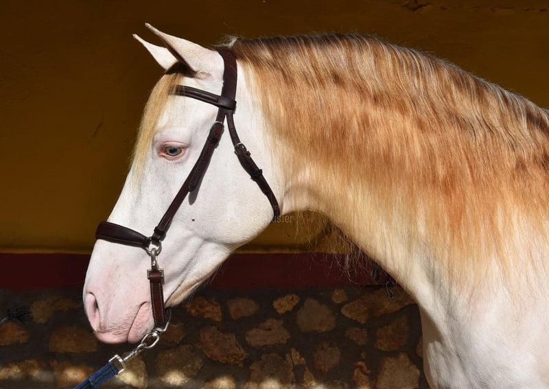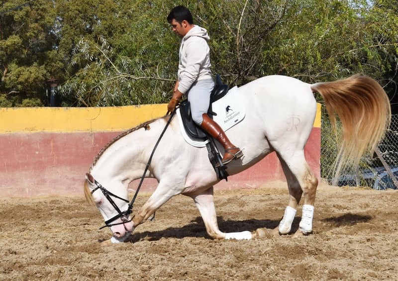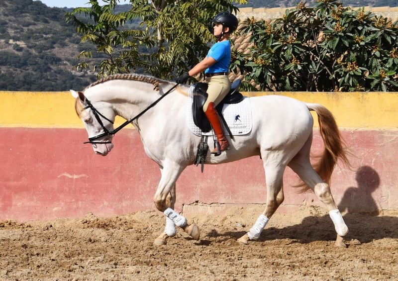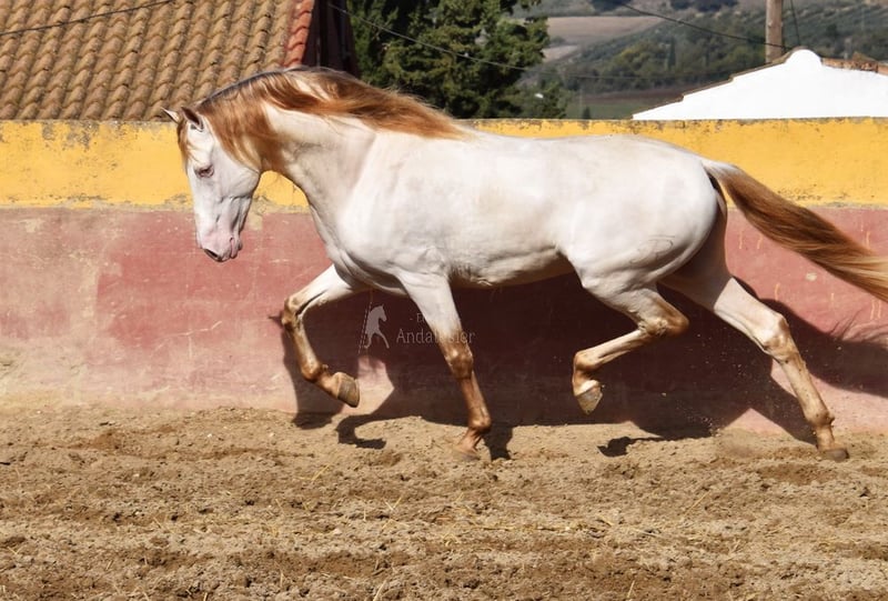 lieber Charakter mit angenehmen Temperament, neugierig, verschmust, in den Grundgangarten geritten, Seitengänge, Rückwärtsrichten, Spanischer Schritt, mit Piaffe und Passage angefangen, verbeugt sich, Gelände, groß, gute Bewegungen, spezielle Farbe, Bayo Perla (CrPrl) mit PRE Papieren, gekört, Piro negativ, für Kinder und schwache Reiter geeignet, Abstammung: Yeguada san Benito Abad, Paco Marti, Yeguada la Llana, Ururopa Gaucho III ist qualifiziert www.elegante-andalusier.com