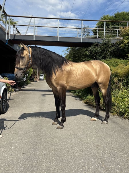A true dream stallion is looking for his perfect human: Spirit is a 6-year-old PRE stallion with a height of 1.67 m and a special color (buckskin). He combines beauty, expression, and character in ideal harmony. Spirit is licensed and impresses not only with his appearance but also with his noble character: - Licensed and with an excellent pedigree from Paco Marti - Kind and reliable in the field, whether alone or in a group. Strong nerves. - Always motivated, eager to learn, and people-oriented - Fine to ride, sensitive, and teachable – perfectly suited for classical riding and refined dressage work Spirit has everything you could wish for in a modern PRE stallion: charisma, rideability, reliability, and a heart of gold. X-ray images are available. You can find ongoing information about our sale horses on our Instagram channel: preschweiz