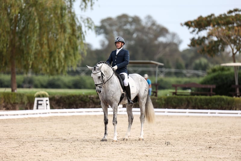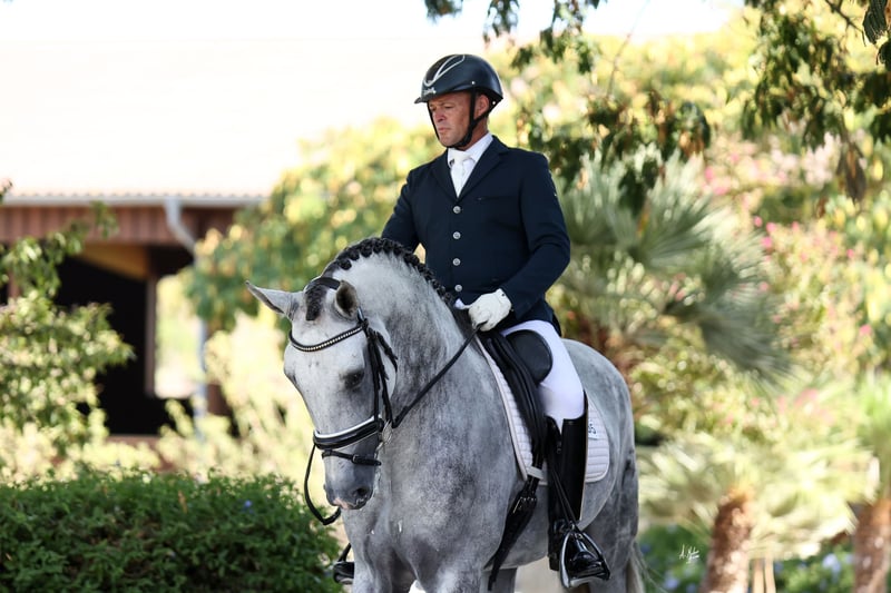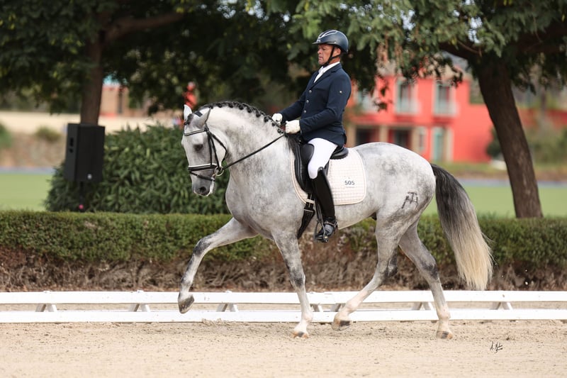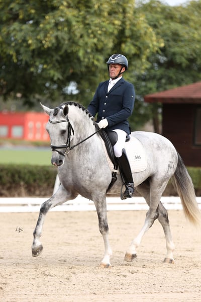 6-jährige Dressurhengst, voll ausgereift, um seine Karriere im Dressursport zu starten und zu festigen. Er zeigt ein ruhiges und ausgeglichenes Wesen, ist im Umgang sowohl am Boden als auch unter dem Sattel sehr freundlich und unkompliziert. Besonders hervorzuheben ist seine große Noblesse, stets kooperativ mit dem Reiter und mit einer positiven Einstellung zur Arbeit. Im Training zeigt er saubere, gerade und rhythmische Tritte bei den Übergängen. Er beginnt, Passage- und Piaffe-Grundlagen zu entwickeln, und demonstriert natürliche Fähigkeiten für die Versammlung, Elevation und Cadenz. Ein Pferd mit sportlicher Perspektive, ideal für Reiter, die einen jungen Partner suchen, der bereits auf höherem Niveau arbeitet.