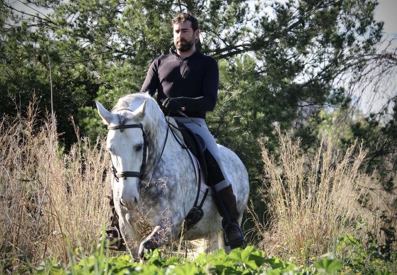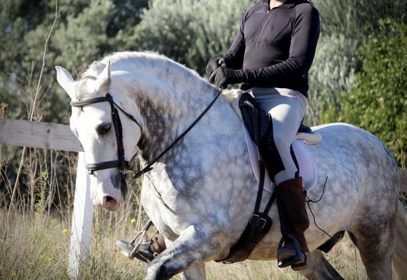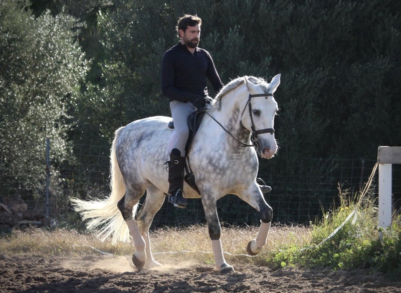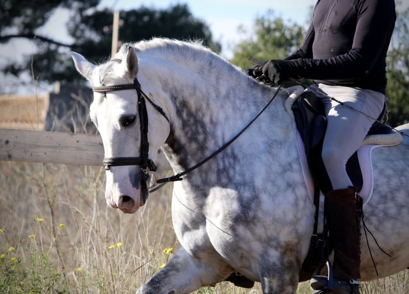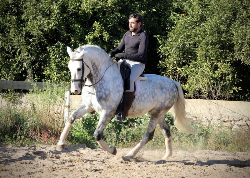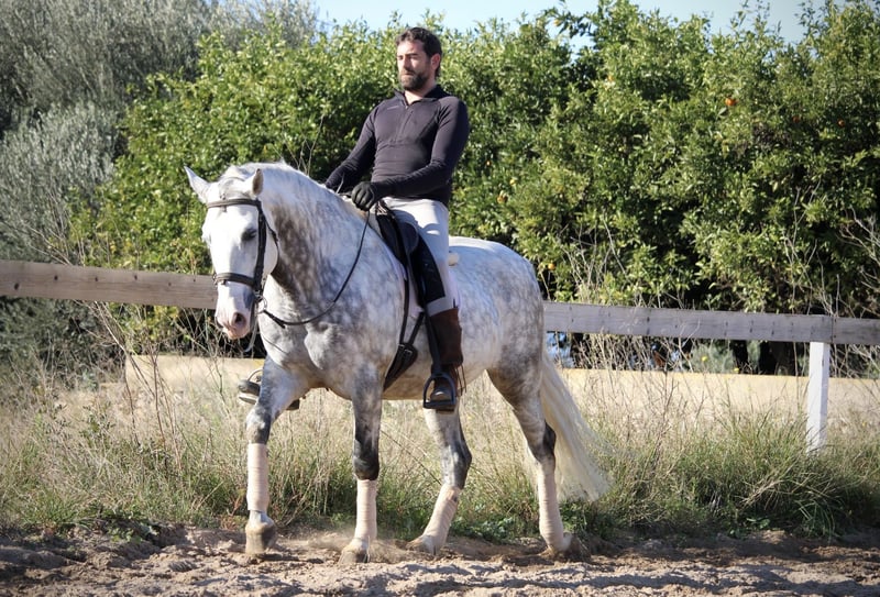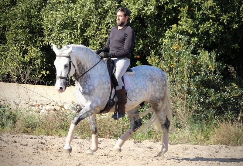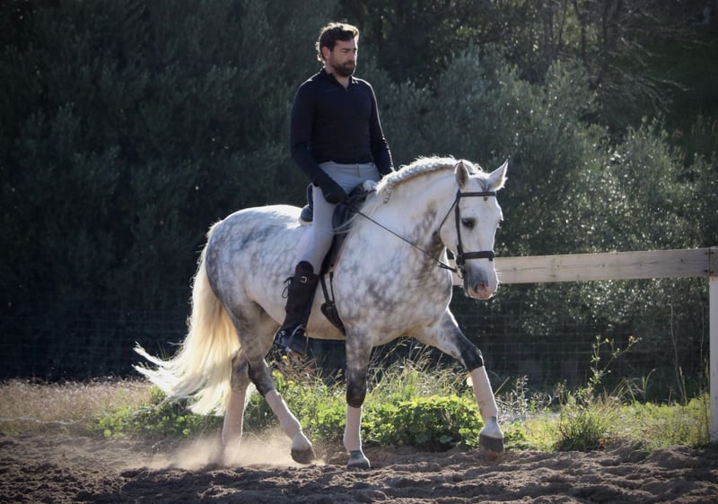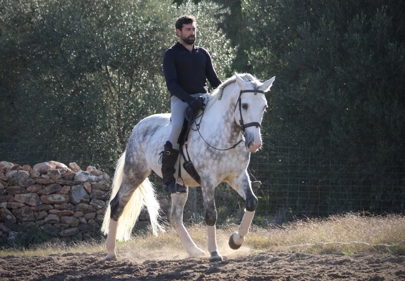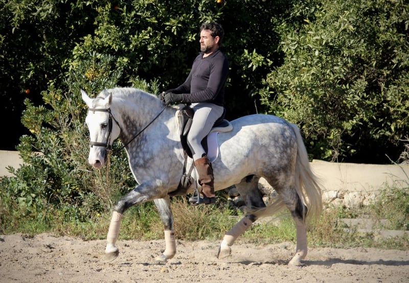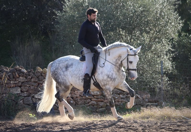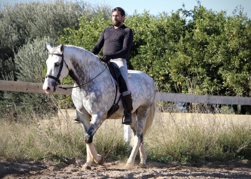 Ein PRE wie aus dem Bilderbuch: der junge Hengst KALAMBRUJO stammt aus der berühmten Zucht Plaza de Armas und überzeugt durch ein besonders barockes Erscheinungsbild. Mit seiner auffälligen Zeichnung und seinem edlen Kopf ist er ein besonders würdiger Vertreter seiner Rasse. KALAMBRUJO ist altersgemäß gut in den GGA geritten, Seitengänge sind angefangen. Er geht zudem sehr gut ins Gelände, alleine wie auch in der Gruppe. KALAMBRUJO ist äußerst sitzbequem und unter dem Reiter sehr brav und zuverlässig. Er besitzt volle Papiere des spanischen Züchtervereins ANCCE und ist frei von Schimmelmelanomen. Standort Spanien.