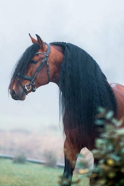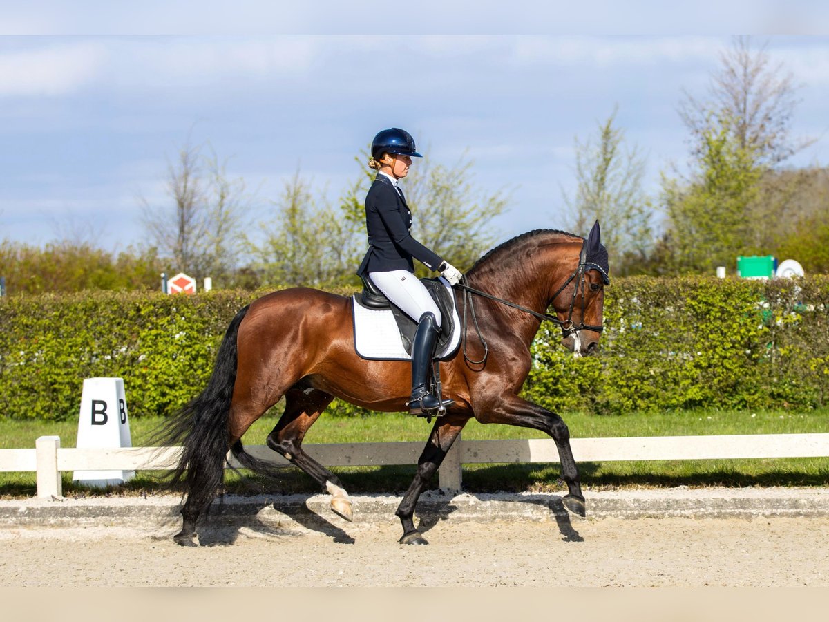 Frisante Torreluna Is a beautiful bay stallion with a fine character, he is only 6 years old but has the WOW factor. Frisante is a horse that steals your heart right away with his beautiful long mane and his huge front pluck and his beautiful bronze glow. He has 3 very good spacious gaits, Frisante possesses a very spacious walk and great trot with good hind leg and an uphill canter. It is a horse with a lot of potential for the future, he closes easily and learns quickly. Frisante is trained at Z level. Frisante comes directly from the breeder Yeguada Torreluna, fully approved including neck and back.