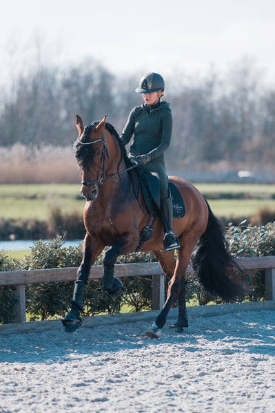 Frisante Torreluna Jest pięknym gniadym ogierem o wspaniałym charakterze, ma zaledwie 6 lat, ale ma czynnik WOW. Frisante to koń, który od razu kradnie serce swoją piękną długą grzywą, ogromnym przednim podbiciem i pięknym brązowym blaskiem. Ma 3 bardzo dobre obszerne chody, Frisante posiada bardzo obszerny chód i duży kłus z dobrą tylną nogą i kłusem pod górę. Jest to koń z dużym potencjałem na przyszłość, łatwo się zamyka i szybko uczy. KNHS L1, a Frisante jest trenowany na poziomie M. Frisante zakwalifikował się do EC MCI Boy horses w październiku 2024 roku. Selekcja NK MCI 2024 niezły wynik 77% i 75% oraz 3 miejsce. Frisante zajął 6. miejsce w Europie na Mistrzostwach Europy MCI i był najlepszym młodym koniem w Holandii. Frisante pochodzi bezpośrednio od hodowcy Yeguada Torreluna, w pełni zatwierdzony, w tym szyja i grzbiet.