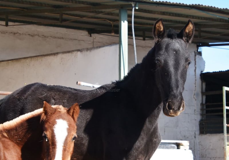 caractère doux, curieux, brut, se tient dehors avec sa mère et d'autres juments et poulains, grand, couleur spéciale, noir avec gène PRL, ascendance : Antonio Guiral Guarga, Hnos Pina, Señorio de Bariain, Bohorquez www.elegante-andalusier.com