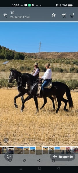 --- **Yegua domada vaquera, nacida en 2015, capa negra** Se ofrece en venta una hermosa yegua de doma vaquera, nacida en 2015, que destaca por su finura, elegancia y clase. De color negro intenso en invierno y castaño oscuro por el Sol del verano, esta yegua ha sido criada en libertad con cuidado, mostrando excelentes aptitud para la cría. Perfecta para jinetes con algo de experiencia que quieran disfrutar de una yegua muy cariñosa y delicada, con buena respuesta y un aspecto impresionante. No dudes en contactarnos para más información y concertar una visita, puedes verla con su potro y con el semental con el que vive en libertad, nieto de Ermitaño III (reproductor de élite), del que está preñada de 9 meses en la actualidad. Se vende junto con su próximo potro.
