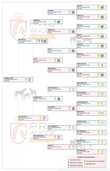 Proven contrast mare, daughter of the multi-award-winning Velero XI from the Yeguada Militar stud farm, with offspring competing in European and American arenas. We are offering for sale a magnificent PRE mare, born in 2008. She is chestnut in color, standing approximately 16.1 hh, making her perfect for those seeking a horse with impressive presence and noble character. Coming from an excellent lineage, this mare combines beauty, stamina, and temperament, making her ideal for breeding; she is started in harness work. Genetic profile (genotype): ggAAEeCCNN Training: stable-bred; early harness principles. Comments: very good pedigree and movement. Produces foals of bay, chestnut, palomino, and torda coat colors. Lineage: Levitón, Deco, Velero XI, Lego, Deco, Agente, Colombiano III. Yeguada Militar, Vizconde de la Montesina, Urquijo, D. Benito Zoido, Bohorquez, Salvatierra, Cárdenas, Martínez Boloix, and Romero Benítez. Don’t miss the opportunity to add an exceptional-quality mare to your stable. For more information and details, please do not hesitate to contact us.