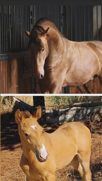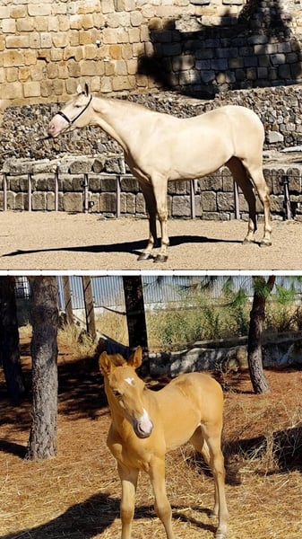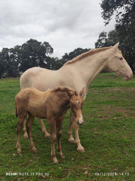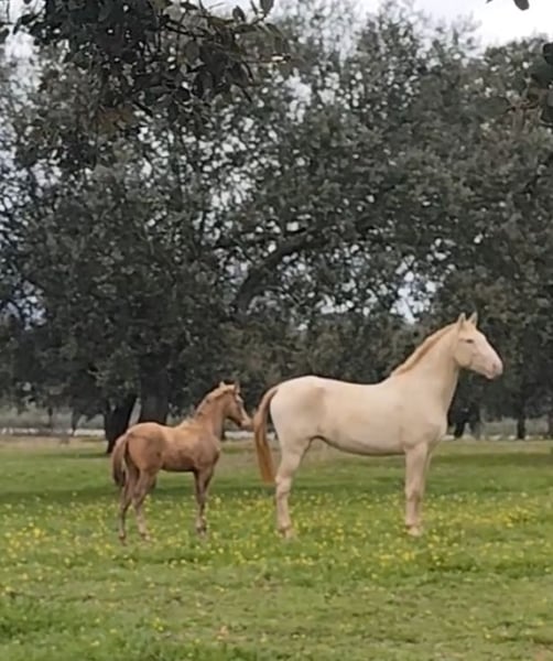 Potra Isabela PRE, mit hervorragendem Stammbaum. Reinrassige spanische Stute. Ihre Mutter hat an bedeutenden nationalen Turnieren teilgenommen und gute Ergebnisse erzielt. Sowohl Mutter als auch Vater stammen von Ismaeli de Paco Martí ab. Auf der Seite der Mutter kommen außerdem die Hengste Sol PM und Quitasueños, zwei herausragende Vertreter ihrer Rasse. Der Hengst ist 1,69 m groß, die Stute misst 1,65 m. Sie zeichnet sich durch ein außergewöhnliches Temperament aus. Verkauft wird die PRE-Potra Isabela, eine der besten Linien im PRE mit diluter Färbung.