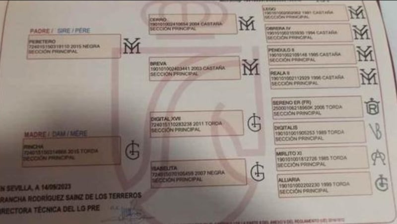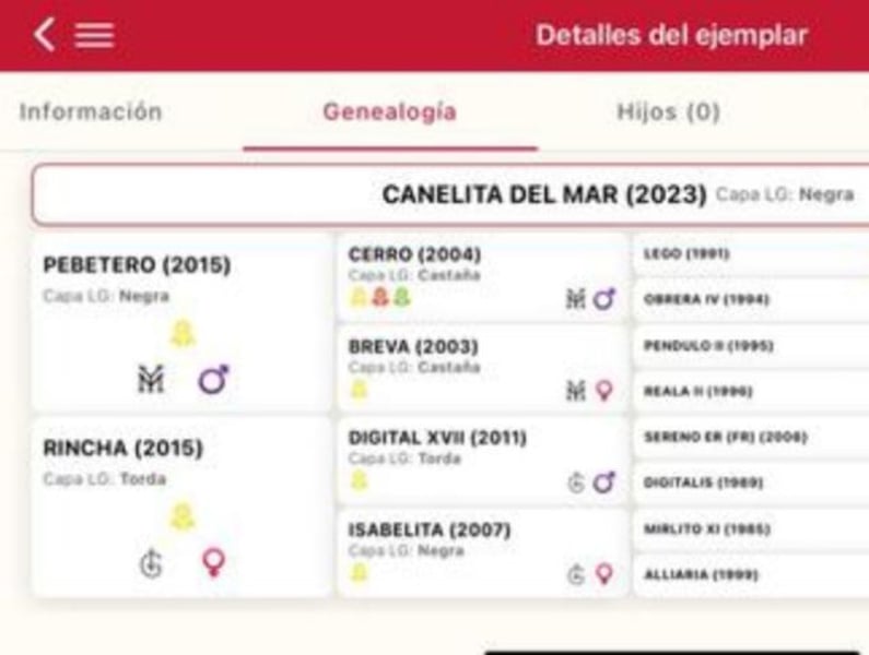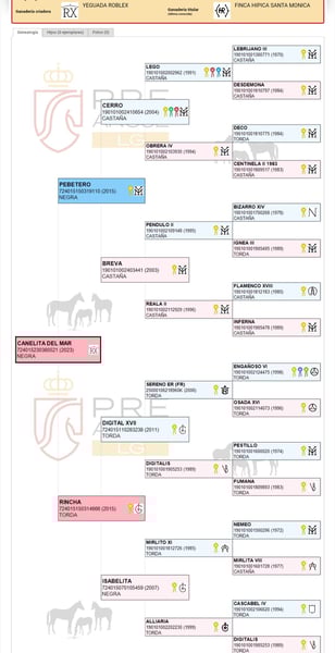 Zwarte PRE-veulen, ingeschreven bij ANCCE met stamboek en goede AFKOMST. Vader PEBETERO van Zwarte kleur, brandmerk Yeguada Militar, hoogte 1,64 en Moeder RINCHA, brandmerk los Retamales, hoogte 1,64. Leeftijd 2 jaar en hoogte 1,55. Zeer vriendelijk, kan longeerlijnen, borstelen, hoeven schoonmaken, douchen, vlechten, enz. Ideaal voor Klassieke Dressuur, Vaquera, Rejoneo of Fokkerij vanwege zijn Afkomst.