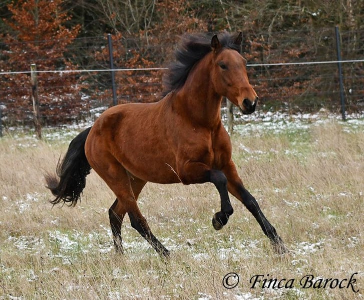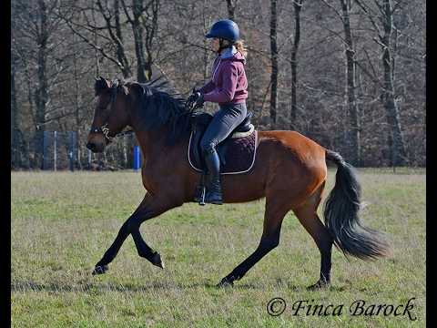 Rasse: PRE Name: Caprichosa CDXV Geschlecht: Stute Stockmaß: 160 cm Alter: 08.03.2021 Farbe: Braun Preis: 7500 € Vater: Malevolo del Pas v. Cubanon (Joven Reproductor) v. Ermitaño III (Majorante + Elite) Mutter: Temprana Noble v. Indiano LVI Caprichosa, ist eine hübsche, schlanke, bewegungsstarke Lady mit freundlichem Charakter. Caprichosa wurde gekauft um als Zuchtstute eingesetzt zu werden. Manchmal kommt es aber im Leben dann doch anders und die Pläne der Besitzerin konnten aus persönlichen Gründen nicht umgesetzt werden. So hatte die süße Caprichosa einen schönen Sommer auf der Weide und wurde nur gelegentlich geritten. Bei uns wird Sie seit Oktober wieder gearbeitet. Sie zeigt sich unter dem Reiter als arbeitswillig, sitzbequem, fleißig und lernbereit. Caprichosa ist in den GGA geritten. Ihr besonderes Steckenpferd ist das Gelände. Hier fühlt Sie sich absolut Zuhause. Ob in der Gruppe oder auch alleine. Auch hier zeigte sie sich aufmerksam, schaut sich neue Sachen kurz an und lässt sich dann aber gut überzeugen, weiter zu gehen. Insgesamt kennt Caprichosa mehr Gelände als Viereck. Caprichosa hat ein Raumgreifenden Trab und eine tolle Bergaufgaloppade. Ihre Bewegungen sind typvoll und sitzbequem. Auch zu einem Sprung sagt sie nicht nein und wäre noch vielseitig förderbar. Eine tolle Maus mit soliden Grundlagen die auf neue Abendteuer wartet! Kontakt: Finca Barock, Tel. 0173-696 31 81, 56291 Wiebelsheim