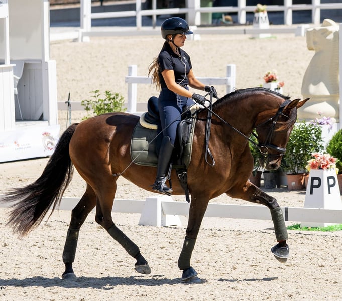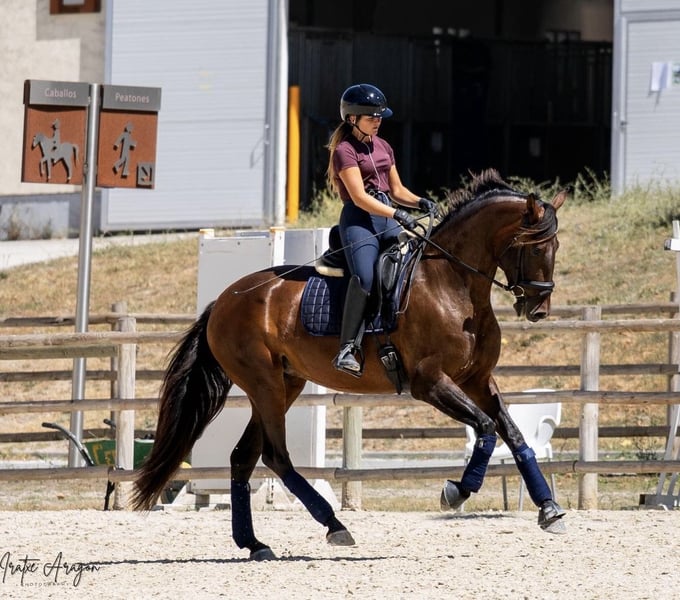 Beautiful PRE filly, 4 years old, with level 1 in dressage. Super character in the arena with other horses, in the field, with the farrier, and during transport. She is very willing to work and has a lot of energy, and a great temperament. She is a good mare for the future in sports. She has OK plates and is negative for Piro.