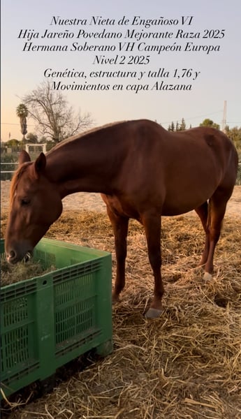 Yegua PRE Alazana de 4 años y medio con estructura, alzada 1,76 y movimientos demostrables. Actualmente preñada de semental palomino Batanero rb (alzada 1,80) para parir en marzo de 2026. A destacar su estructura, talla y movimientos en capa alazana, muy correcta morfológicamente. Valoración de apta reproductora con muy buenas reseñas.
