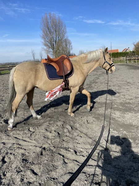 Deze lieve, leergierige, mensgerichte en sociale merrie zoekt de juiste match. Leeftijd: 5 jaar Schofthoogte: 1.58 m ( niet officieel gemeten) Kleur: Palomino Vrij van PSSM1. Inclusief Carta Mar Wonderful x Atenta VLR Al sinds veulen in mijn bezit. Geen trauma’s. Is zadelmak, maar nog niet doorgereden. Bitloos beleerd. Onder het zadel eerder wat terughoudend, dan heel erg loperig. Mogelijk is dit een kwestie van conditie opbouwen, maar ik heb ook de indruk dat ze het werk in de bak niet zo leuk vind. Om die reden denk ik dat een andere ruiter haar gelukkiger zal maken, omdat ik juist graag fanatiek dressuurmatig train en houd van paarden met meer energie/looplust. Kan onder het zadel soms subtiel wat spanning opbouwen. Als je dit niet tijdig herkent en af laat vloeien, kan dit uiten in flinke bokkensprongen als haar emmertje overloopt. Daarna is het wel direct klaar. Ze blijft niet aanhouden of schrikken op dezelfde plek. Hierdoor is ze niet geschikt voor de beginnende ruiter. Ik verwacht dat dit zal verbeteren als ze verder wordt doorgereden, omdat ze verder heel rustig en nuchter is. Ik denk dat ze het beste past bij een zelfverzekerde recreatie ruiter, die naast het rijden in de bak ook andere dingen met haar doet, zoals buitenritten, vrijheidsdressuur, lange lijnen en liberty. Vooral dit laatste zou haar denk ik heel goed passen. Aan de hand is ze erg nuchter. Ze is goed verkeersmak. Gaat regelmatig mee wandelen. Hangt dan niet aan een ander paard. Laat zich snel geruststellen door haar begeleider als ze toch iets spannend vindt. Is respectvol, mensgericht en goed opgevoed. Reageert goed op lichaamstaal en stemhulpen. Ze staat hier in een kleine kudde. 24/7 buiten met schuilstal, met beperkte weidegang (4 à 5u per dag) en altijd toegang tot hooi uit slowfeeders. Ze gaat alleen weg als ze het (nog) beter krijgt dan hier en dus enkel bij een juiste match. Tijdens een Metavitalscan is per toeval gebleken dat ze de ziekte van Lyme heeft. Dit speelde volgens de scan geen actieve rol meer. Via bloedonderzoek is dit bevestigd (heeft antistoffen tegen de bacterie). Ze krijgt hiervoor een kruidensupplement en lijkt er verder geen klachten van te hebben. Daarnaast heeft ze vorig jaar september een allergische reactie gehad op iets. Ze stond onder de bulten (netelroos). Ik heb een allergietest gedaan, maar hier kwam geen duidelijke uitslag uit (is in te zien). Afgelopen september stond ze weer enkele weken onder de bulten, die daarna vanzelf weer verdwenen. Het lijkt dus een seizoensgebonden allergie voor iets hier op het terrein. Laatste foto is vader. Eén na laatste foto met moeder. Indien gewenst is haar splinternieuwe, aangemeten Deuber zadel over te nemen ( El Campo, in de kleur Havana/cognac, S2) + bijpassend hoofdstel (voor een bit) en een cognac bitloos hoofdstel (Edix).