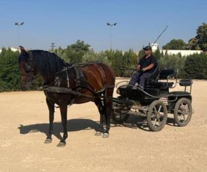 PRE mare used for driving, gentle and calm This mare is one of those with whom you can enjoy driving without the slightest difficulty.cation. She has a exceptional character and a natural tranquility that makes it very safe in all situations. She is harnessed and perfectly accustomed to going out on all types of terrain: City, countryside, traffic, other horses… Nothing impresses her. She works with regularity, consistency and confidence, always listening to her driver. With her attitude and experience, she is ideal for someone looking for a gentle, reliable mare who is already used to everything, perfect for enjoying driving in complete serenity. IberHorse: We select mares and horses of noble lineage, well-balanced and with a sound temperament. If this PRE (Purebred Spanish Horse) interests you, contact us to schedule a call or arrange a visit. Upon seeing her, you'll immediately understand why she inspires so much confidence.