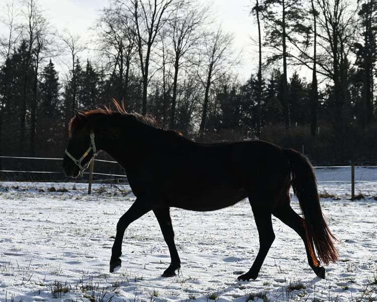 Macarena de Lucia is a 5.5-year-old PRE black mare with pure Escarlata lineage. Her breeding index is 98.31%, and she is a homozygous mare for the black color EEaa. Currently, Macarena stands at 159 cm tall, and it is likely that she may grow another 1 or 2 cm. She is very strong-minded, affectionate, and friendly. Macarena is ridden both in the arena and on trails, where she demonstrates good behavior with a pleasant forward drive. So far, she has had 2 filly foals, one of which she is still nursing until September; the births went well. The Escalera line is one of the oldest bloodlines in Spain and is the result of a consistent breeding program by a family that goes back more than 200 years. A notable characteristic of Escalera horses is their high willingness to perform, baroque, noble horses with physical strength, good rideability, and outstanding movements. The foundation of Escalera horses consisted mainly of brown mares, with few exceptions of blacks, which were then paired with the best and most athletic stallions from the Yeguada Militar. For this reason, Escalera horses are particularly suited for dressage and consistently rank high at various breeding shows. Macarena is vaccinated, regularly dewormed, and in excellent health. She is familiar with farm machinery and other farm animals as well as playing children, and she is good for the farrier and loading. After the birth of her foal, she was checked by an osteopath. Her daughter Hermosa Perla Negra can be weaned starting in September. Sire: Escogido XXIII Dam: Manzanillo XII