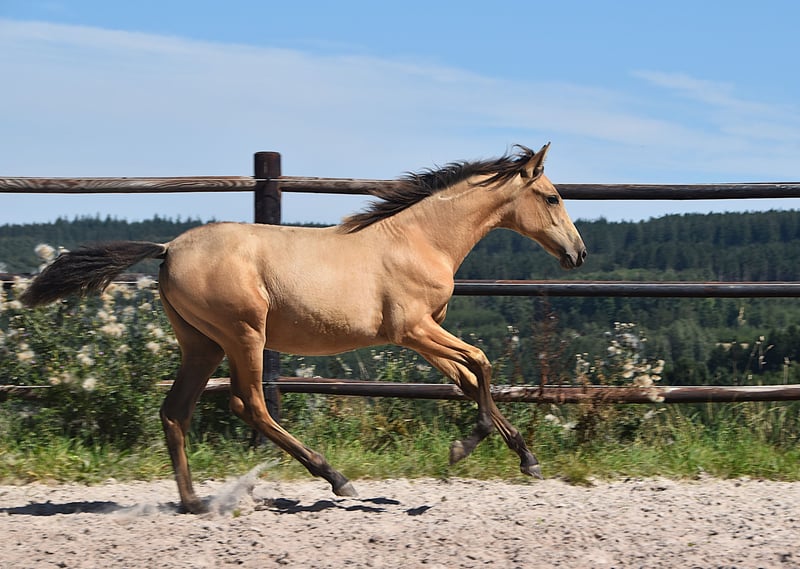 Luminosa ist eine Buckskin PRE-Stute, geboren am 4. April 2025, aus Herrerilla Cen und von Mar Wonderful. Ihre Mutter wurde von der bekannten Yeguada Centurión gezüchtet, Tochter des berühmten Delegado Mac, mit überwiegend Cárdenas-Blutlinien. Ihr Vater, unser perlino Hengst Mar Wonderful, hat sich bereits als erfolgreicher Züchter bewährt und uns mutige Fohlen mit schöner Bewegung geschenkt. Luminosa liebt den Kontakt zu Menschen und lässt sich nicht leicht beeindrucken. Sie hat all die Qualitäten, um das perfekte Familienpferd zu werden, sei es für Dressur, Freizeitreiten oder einfach als wunderbare Begleiterin. Sie wird mit vollständiger ANCCE-Dokumentation geliefert. Wir können auch TRACES-Dokumente arrangieren und den Transport organisieren, falls erforderlich. Luminosa ist in einer Herde auf der Weide aufgewachsen, wurde regelmäßig entwurmt und hat hochwertiges Futter erhalten.